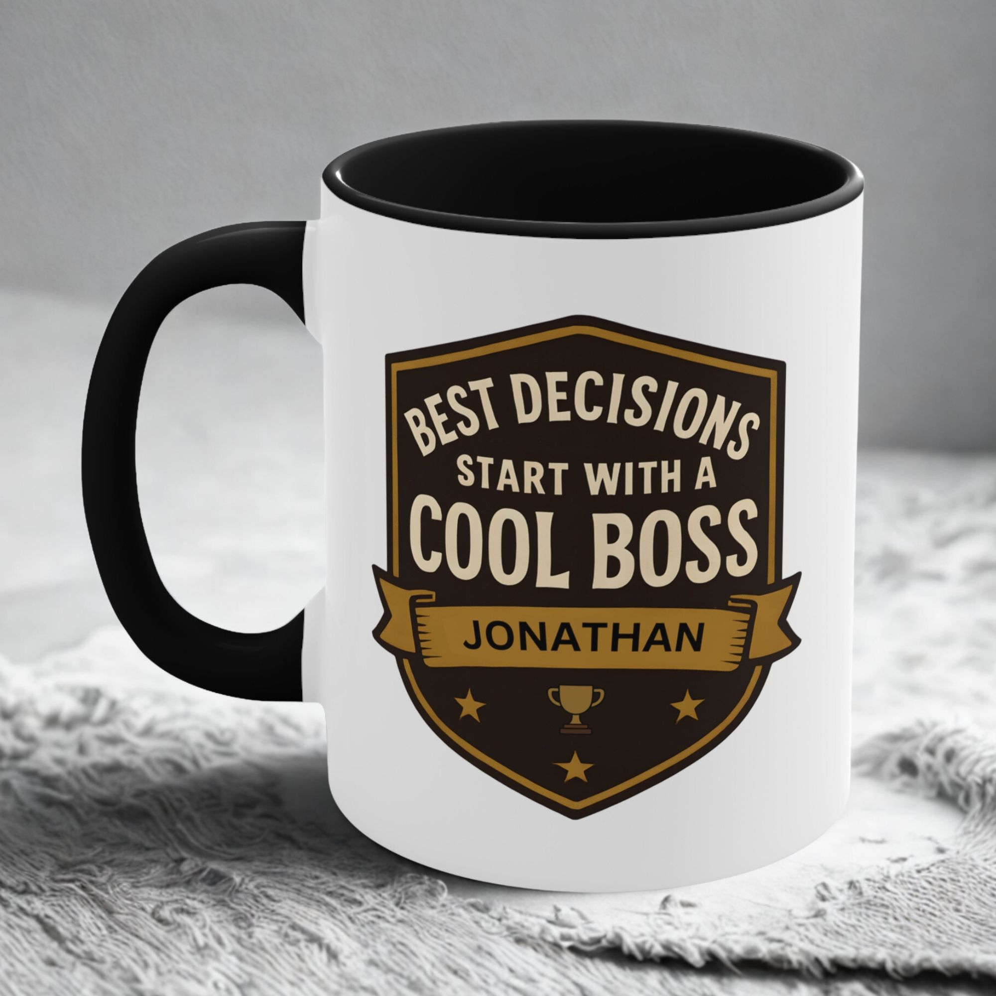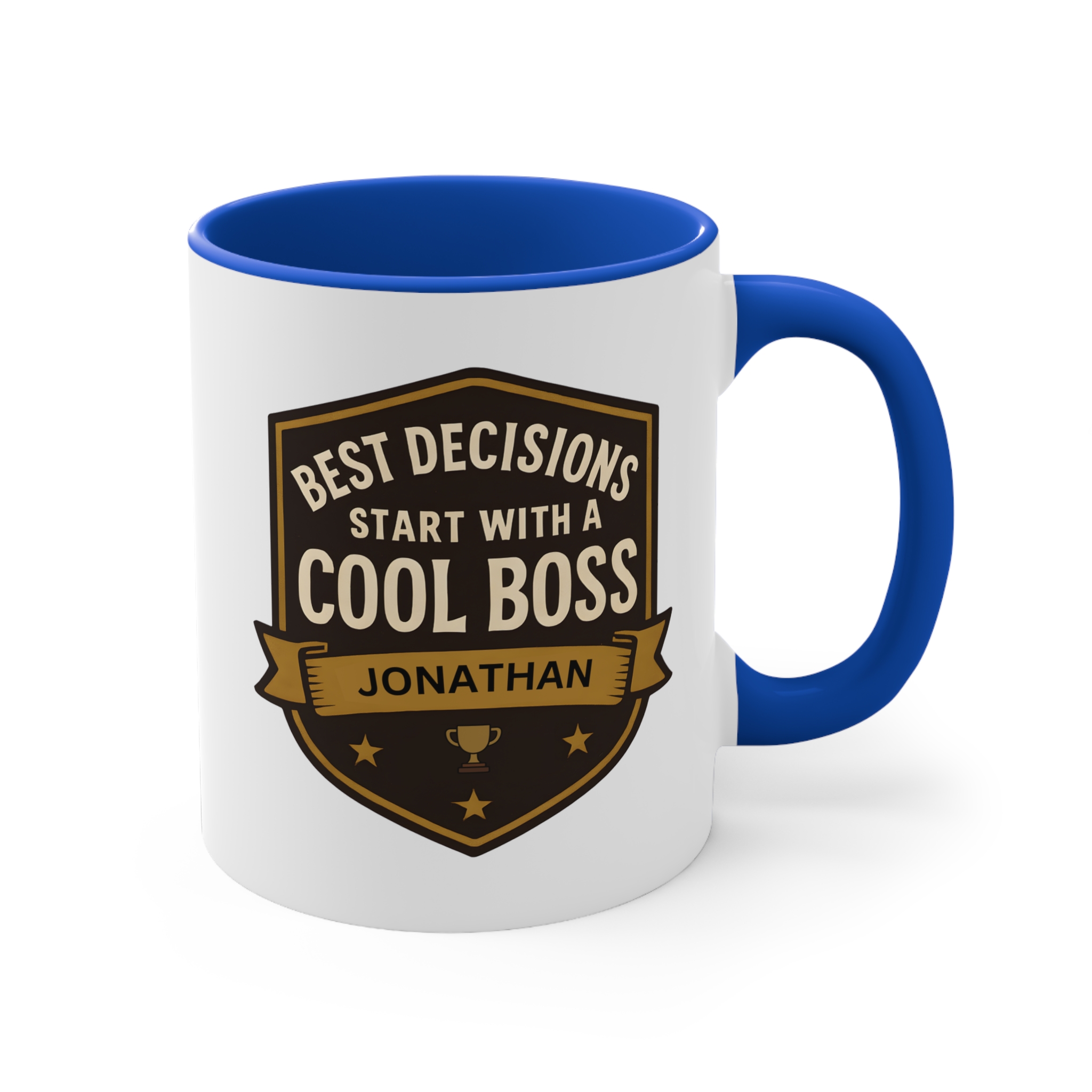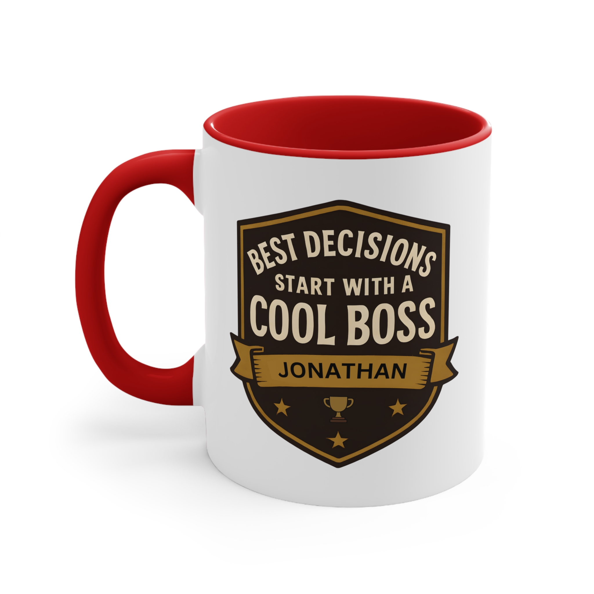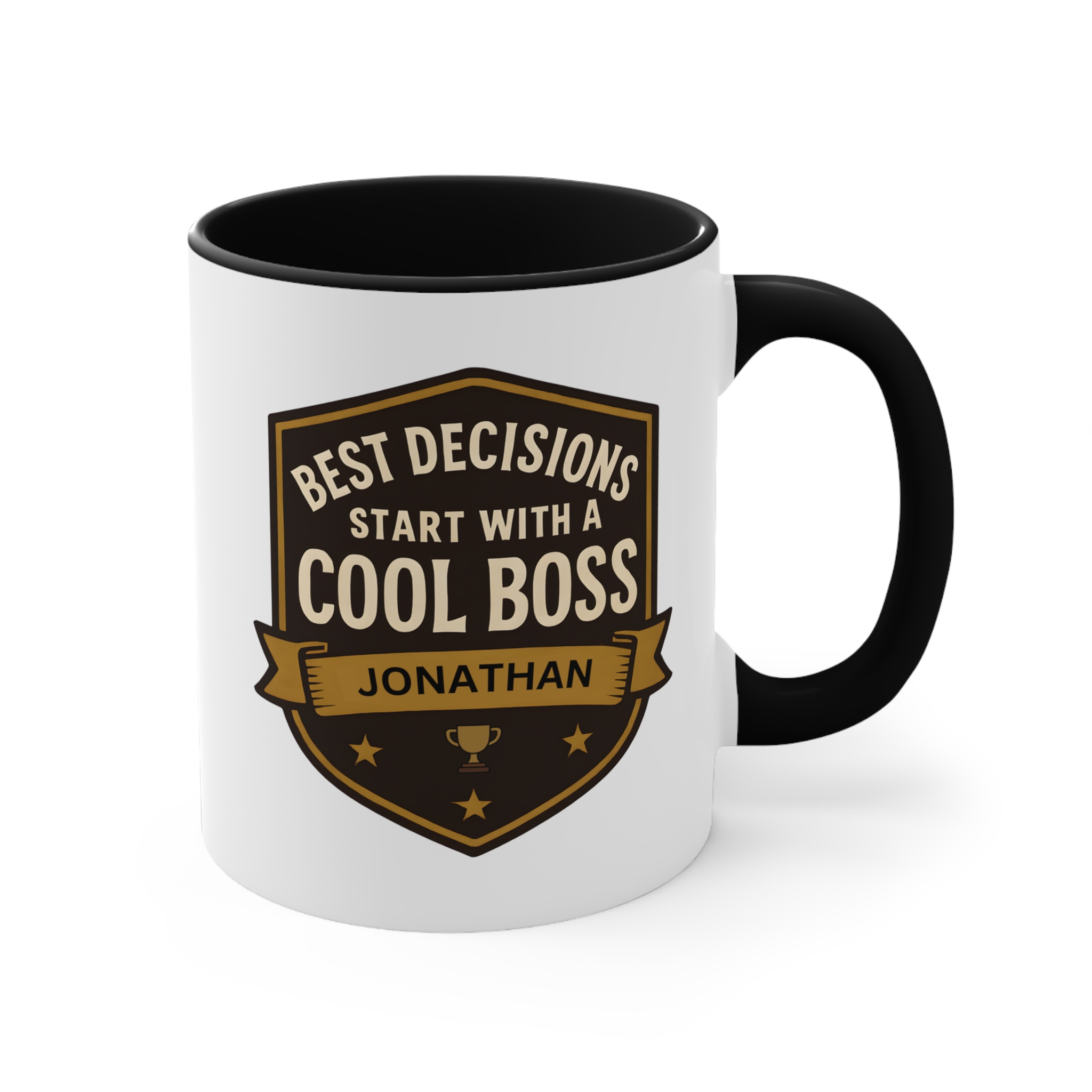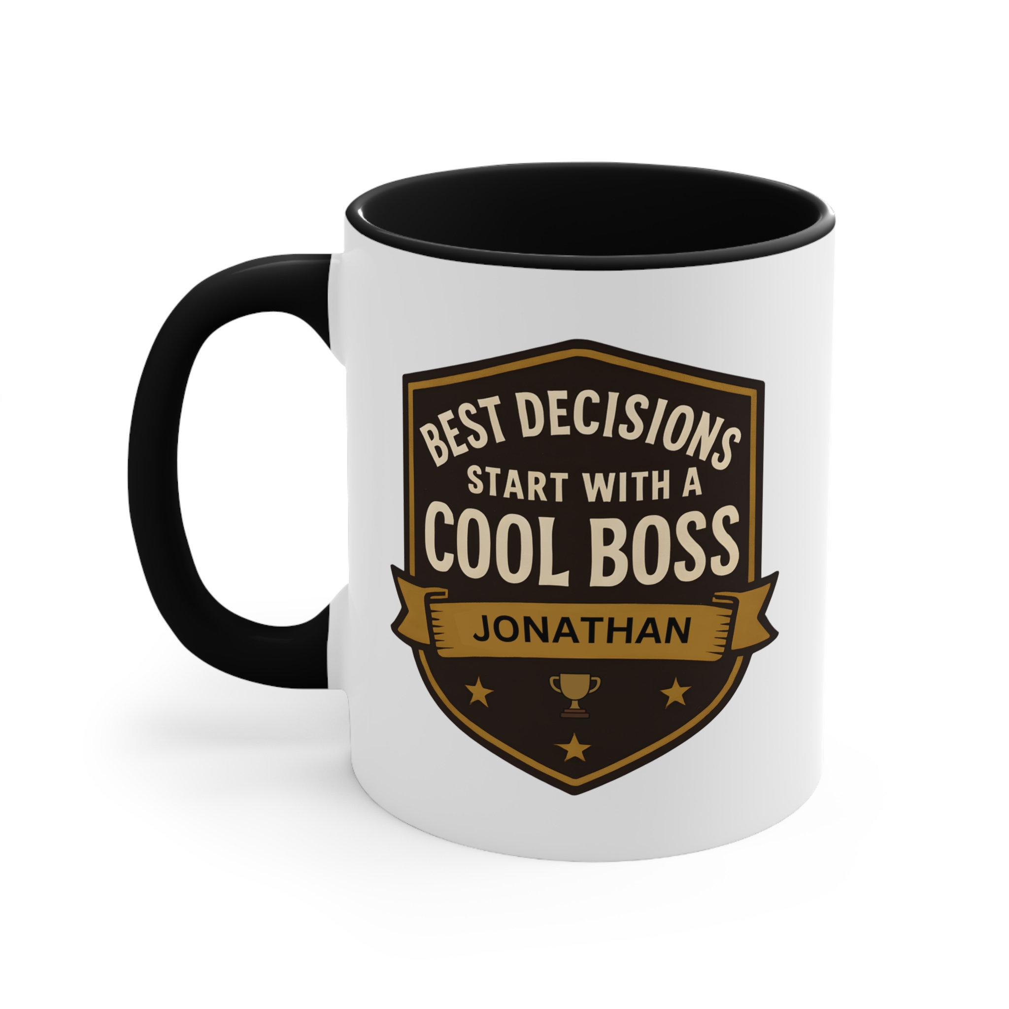 This best decisions cool boss mug uses a bold shield badge layout with premium gold and dark tones, giving it an executive, professional feel. The custom name printed on the banner — shown here as “Jonathan” — adds a personalised touch that turns this mug into a keepsake rather than a generic office gift.