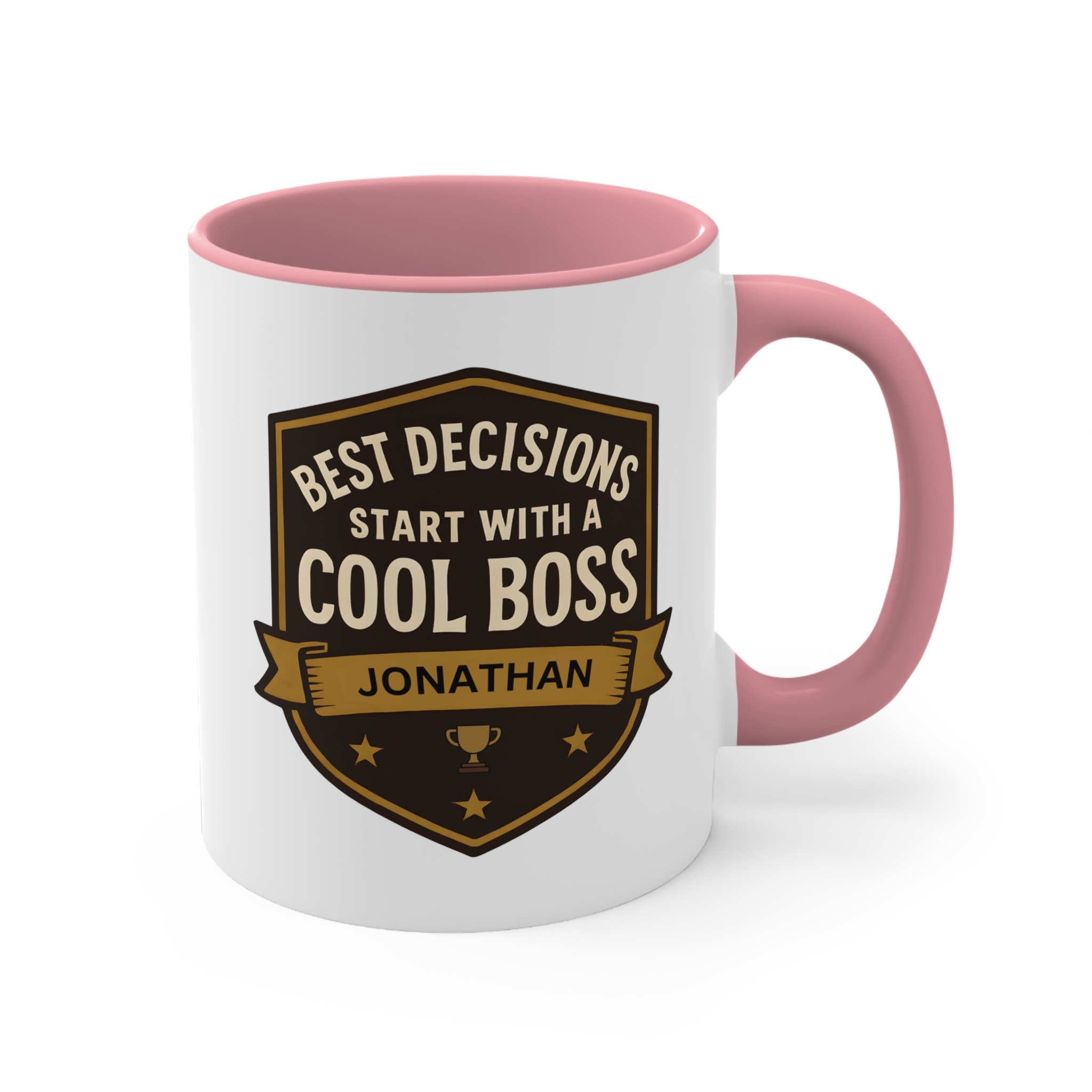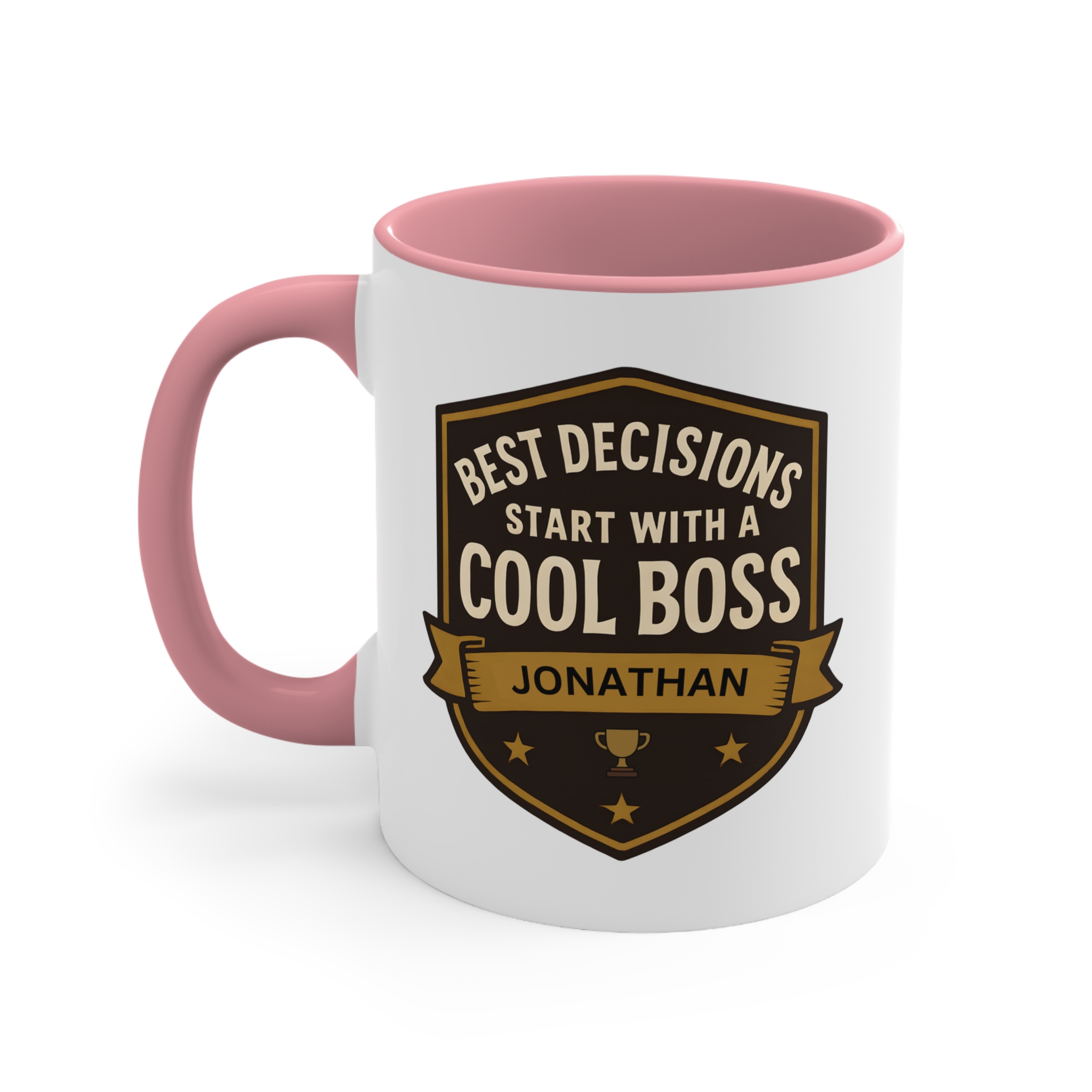 Best decisions cool boss mug featuring an award-style design with personalised name. 11oz ceramic mug with black handle, microwave safe, hand wash recommended.