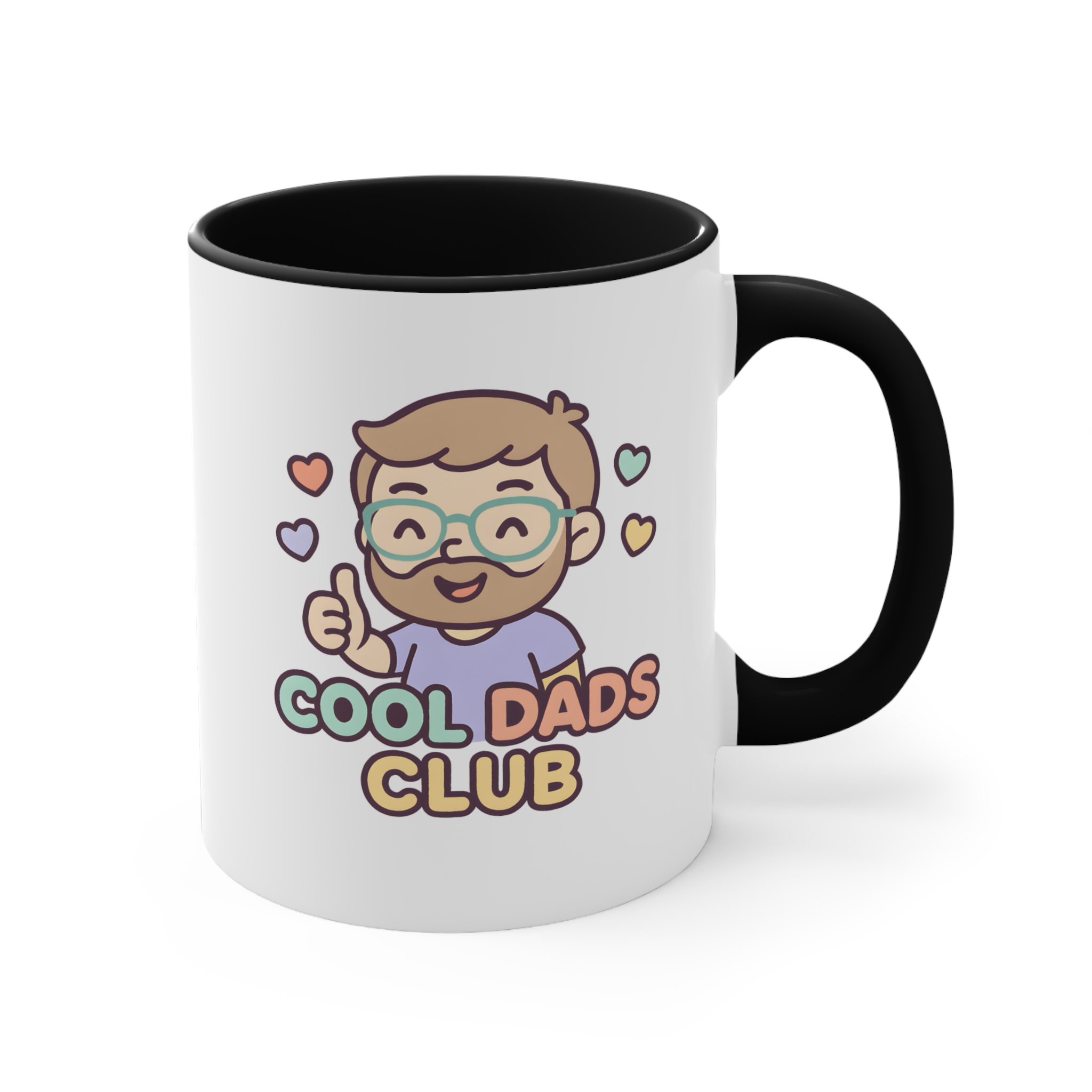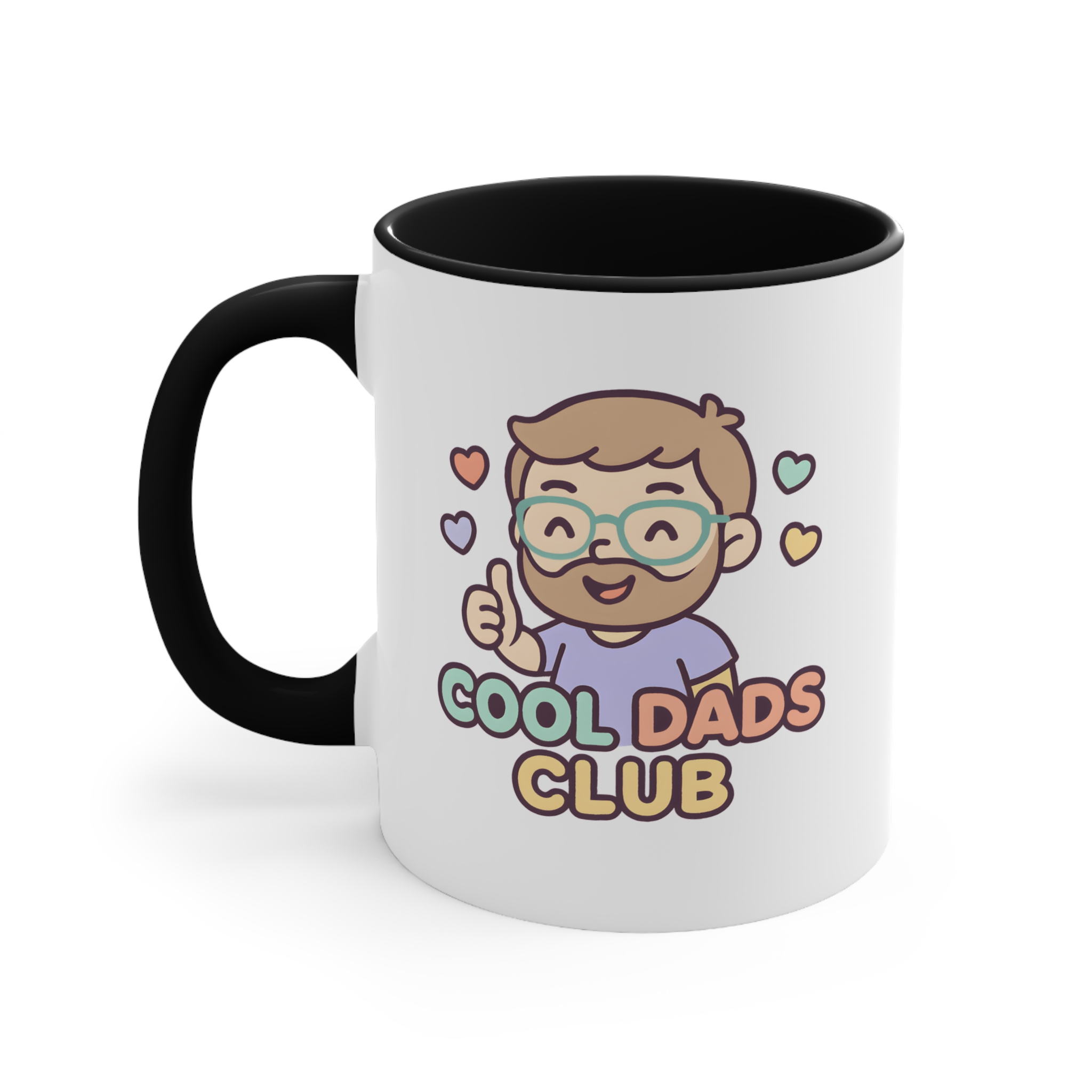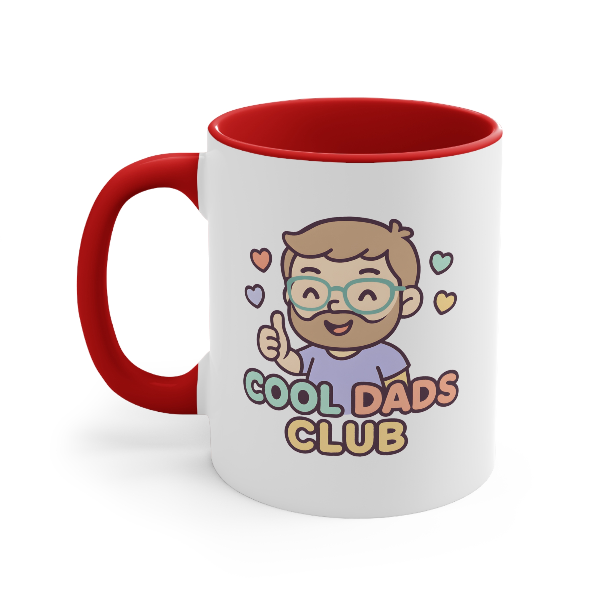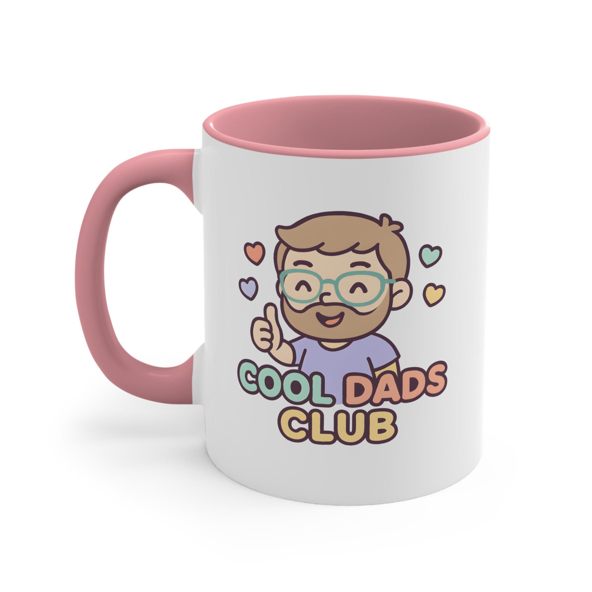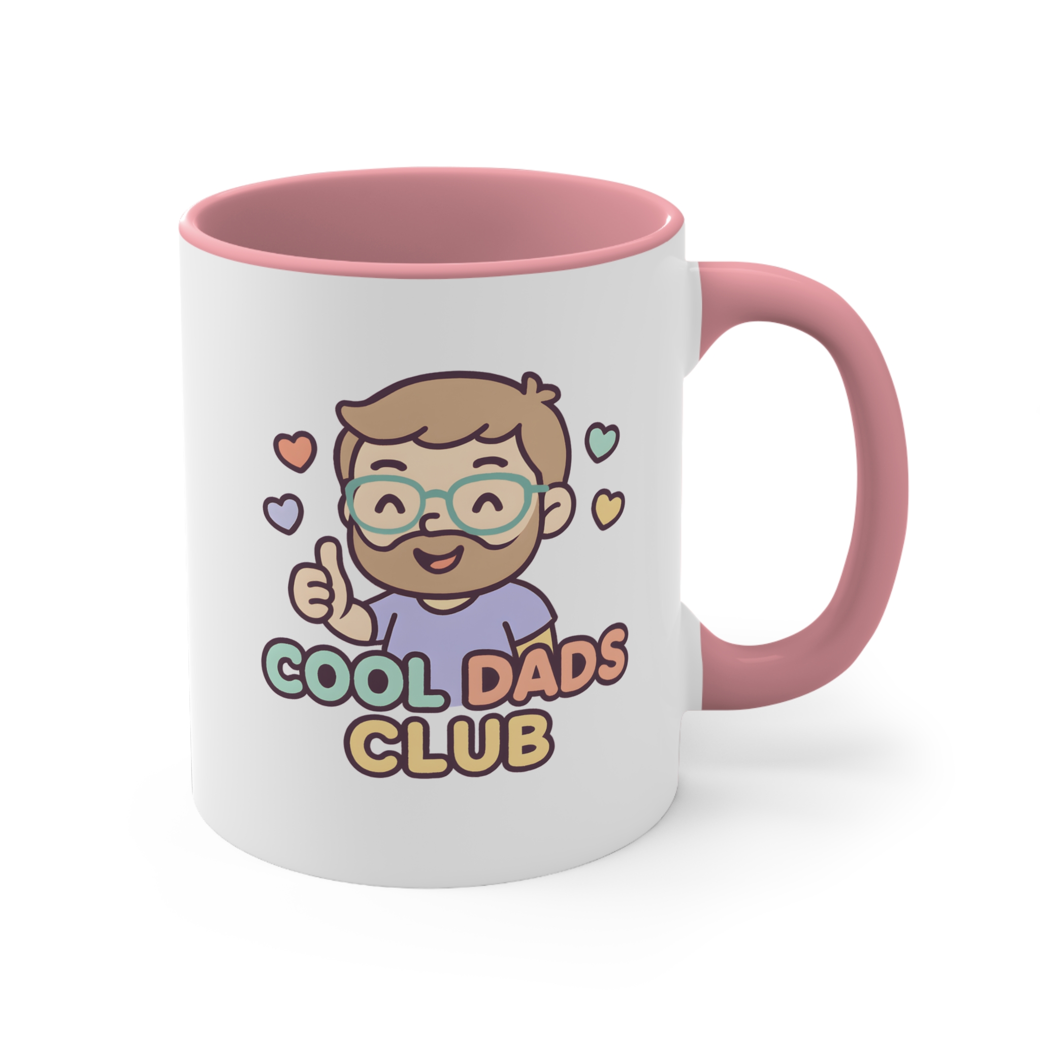 Cool dad mug featuring a cute “Cool Dads Club” illustration. 11oz ceramic mug with pink handle and interior. Microwave safe, hand wash recommended.