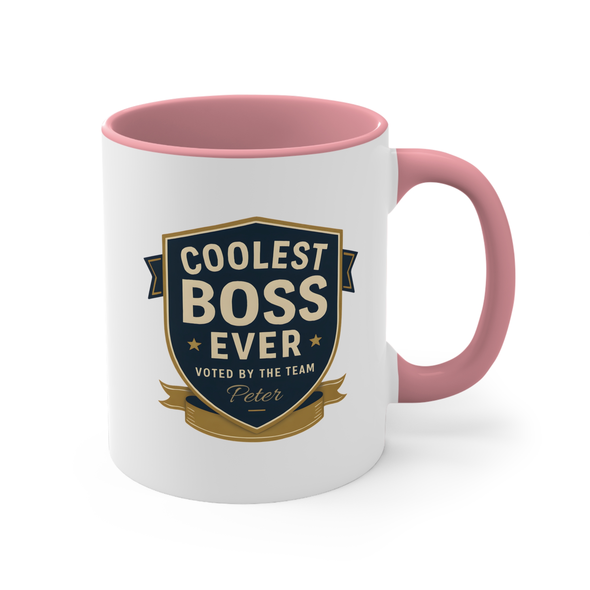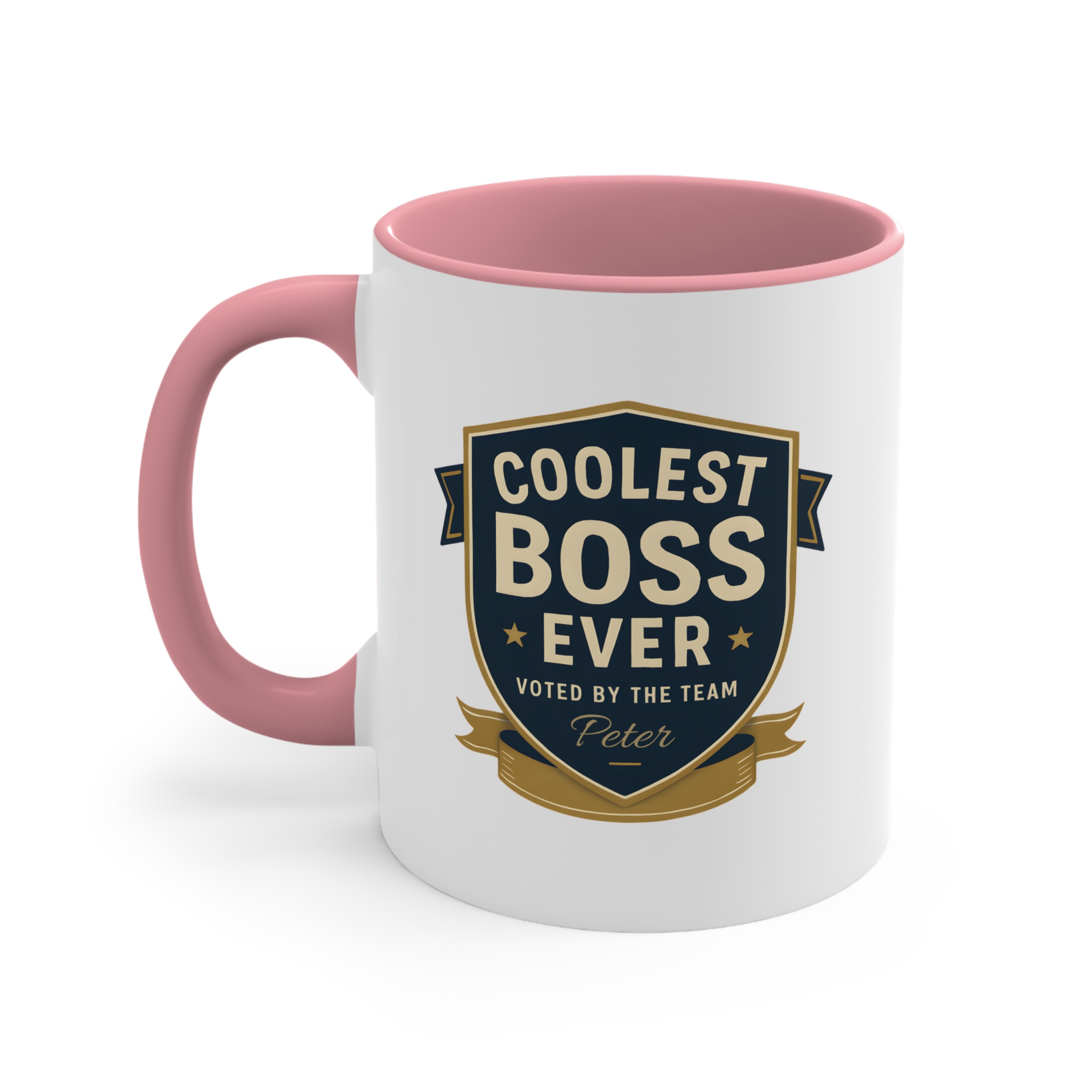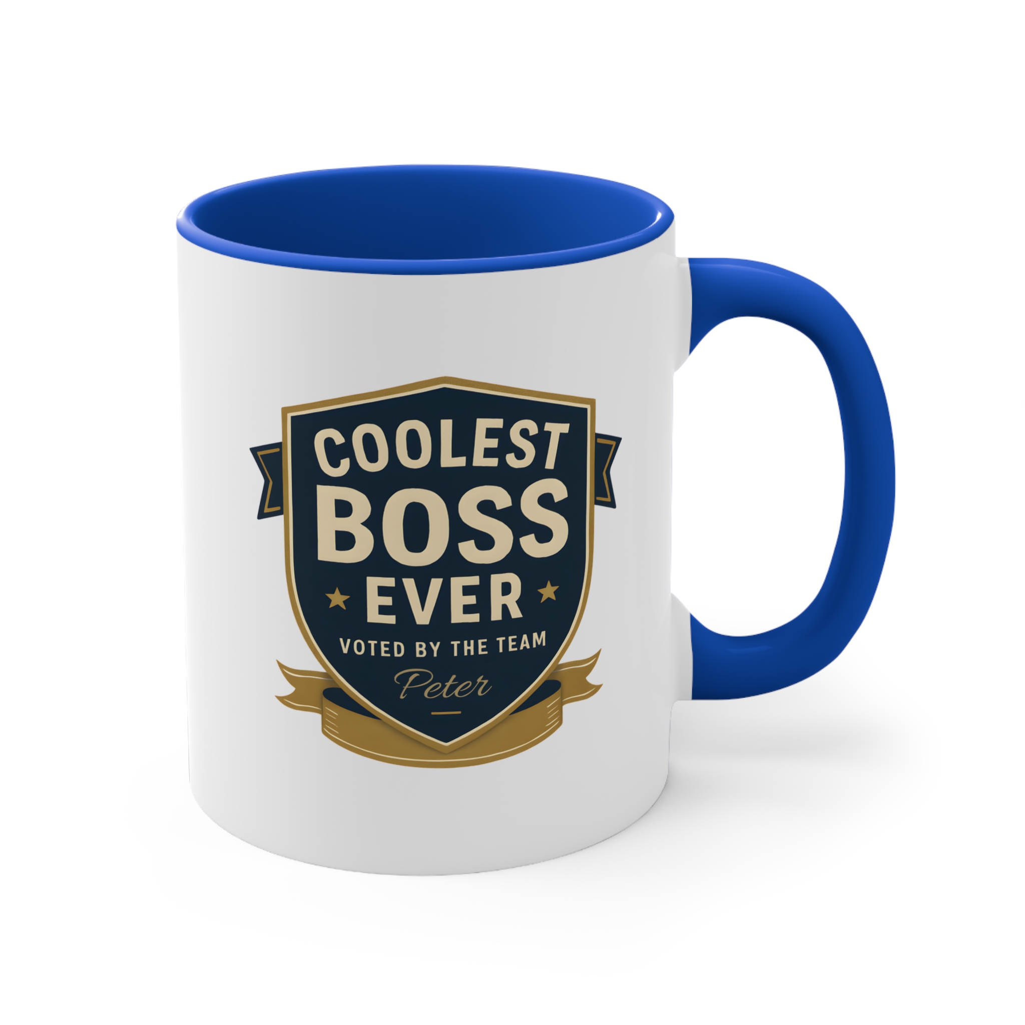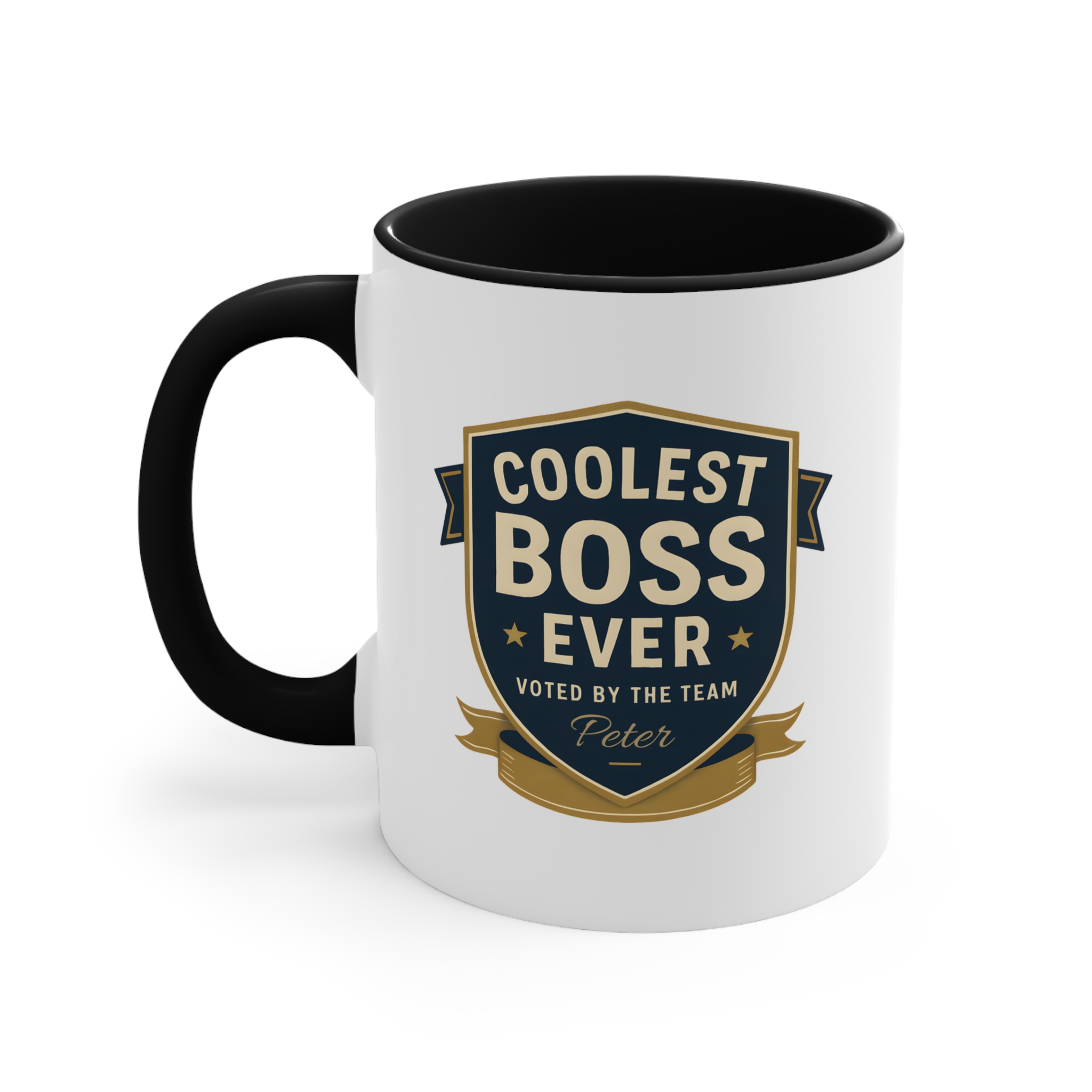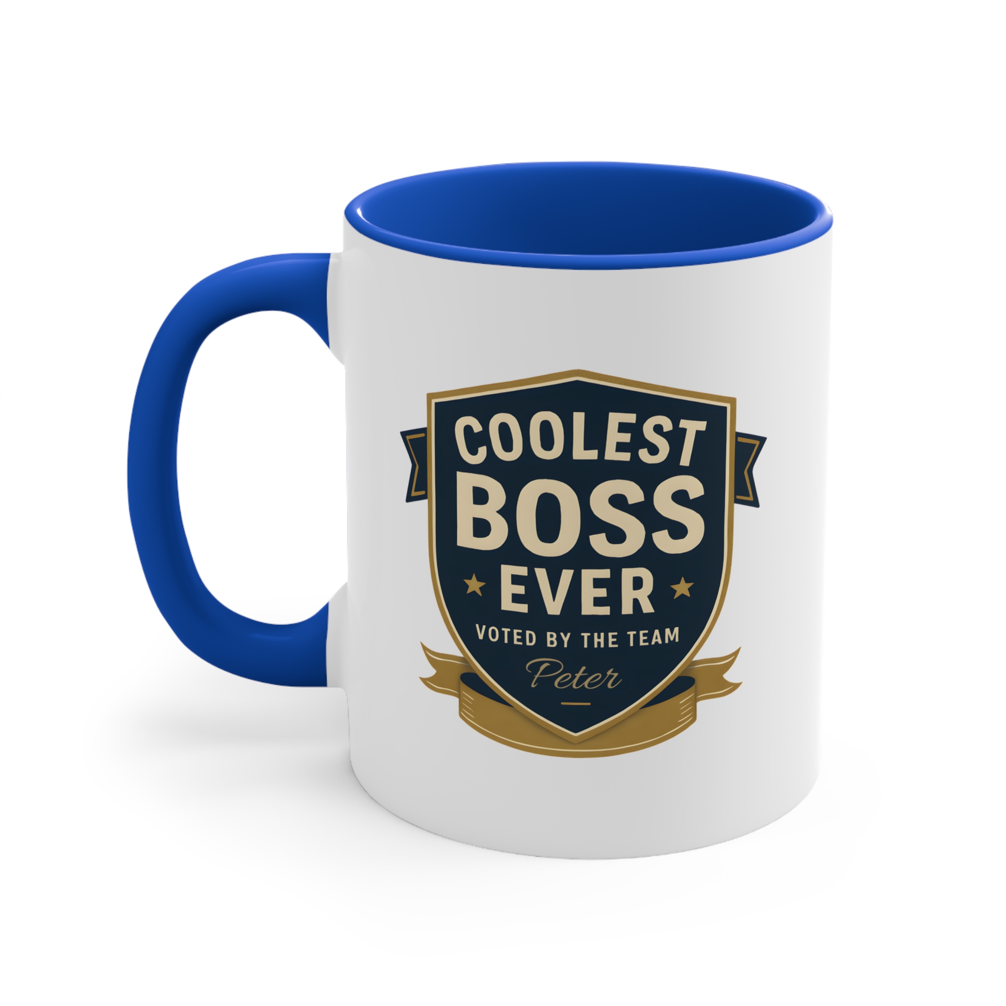 This custom coolest boss ever mug features a bold badge design with elegant gold and navy tones, giving it a professional yet celebratory look. The custom name printed below the design — shown here as “Peter” — adds a personal touch that turns this mug into a meaningful keepsake.