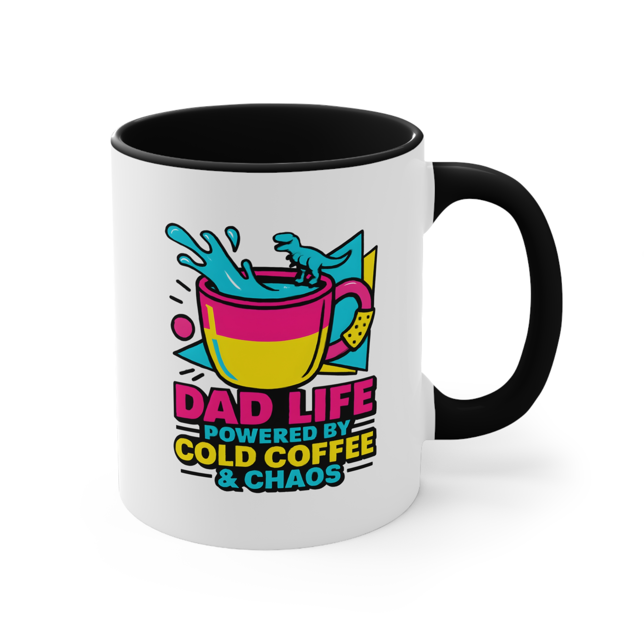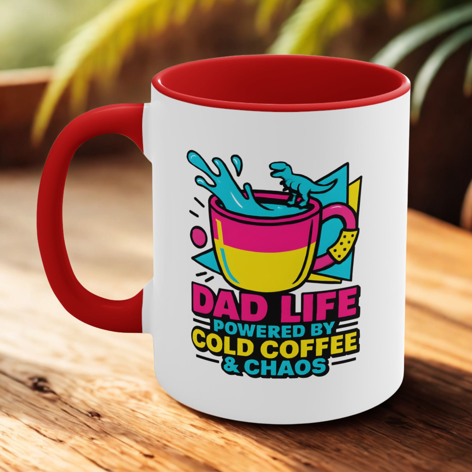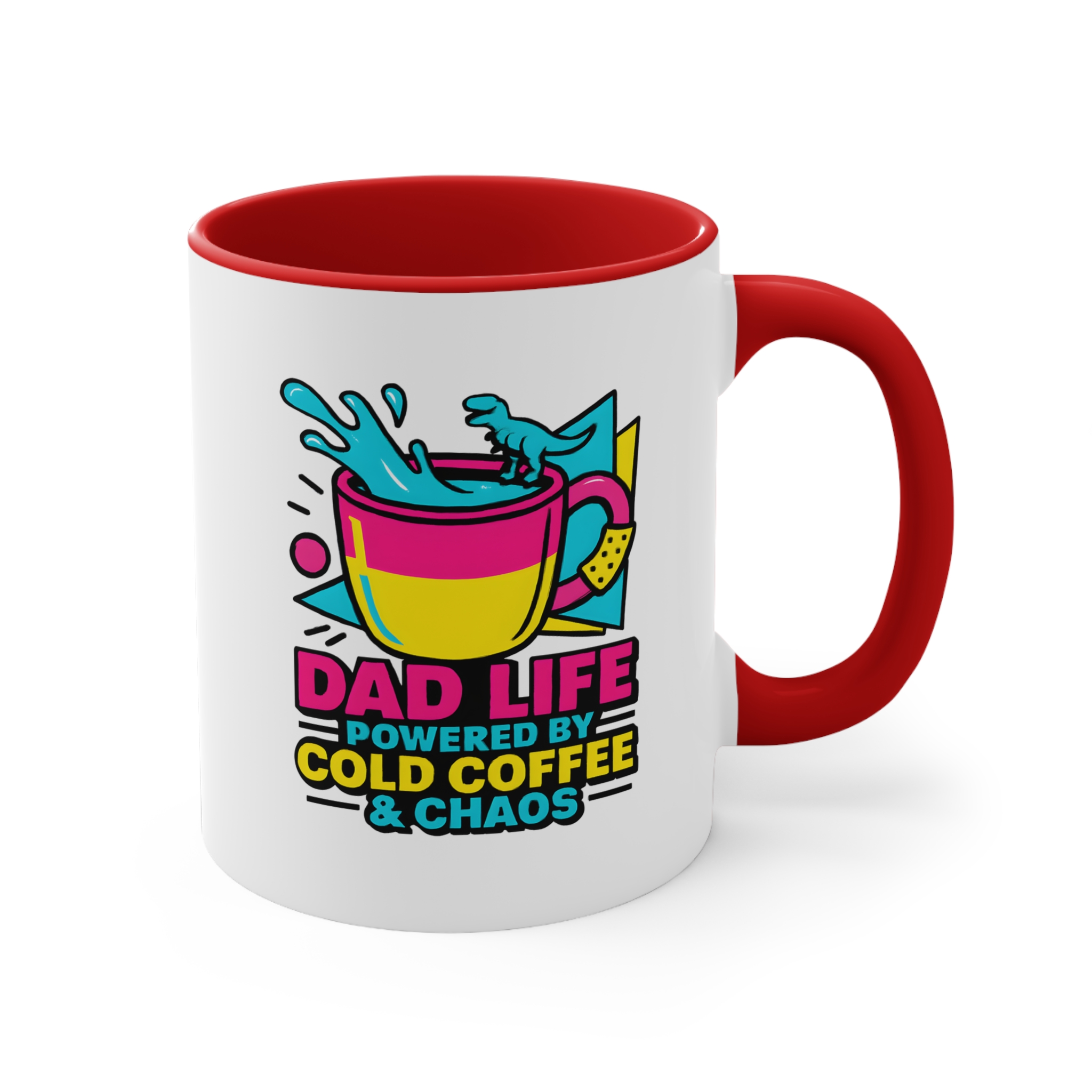 Dad life coffee mug with colourful “Powered by Cold Coffee & Chaos” design. 11oz ceramic mug with red handle and interior. Microwave safe, hand wash recommended.