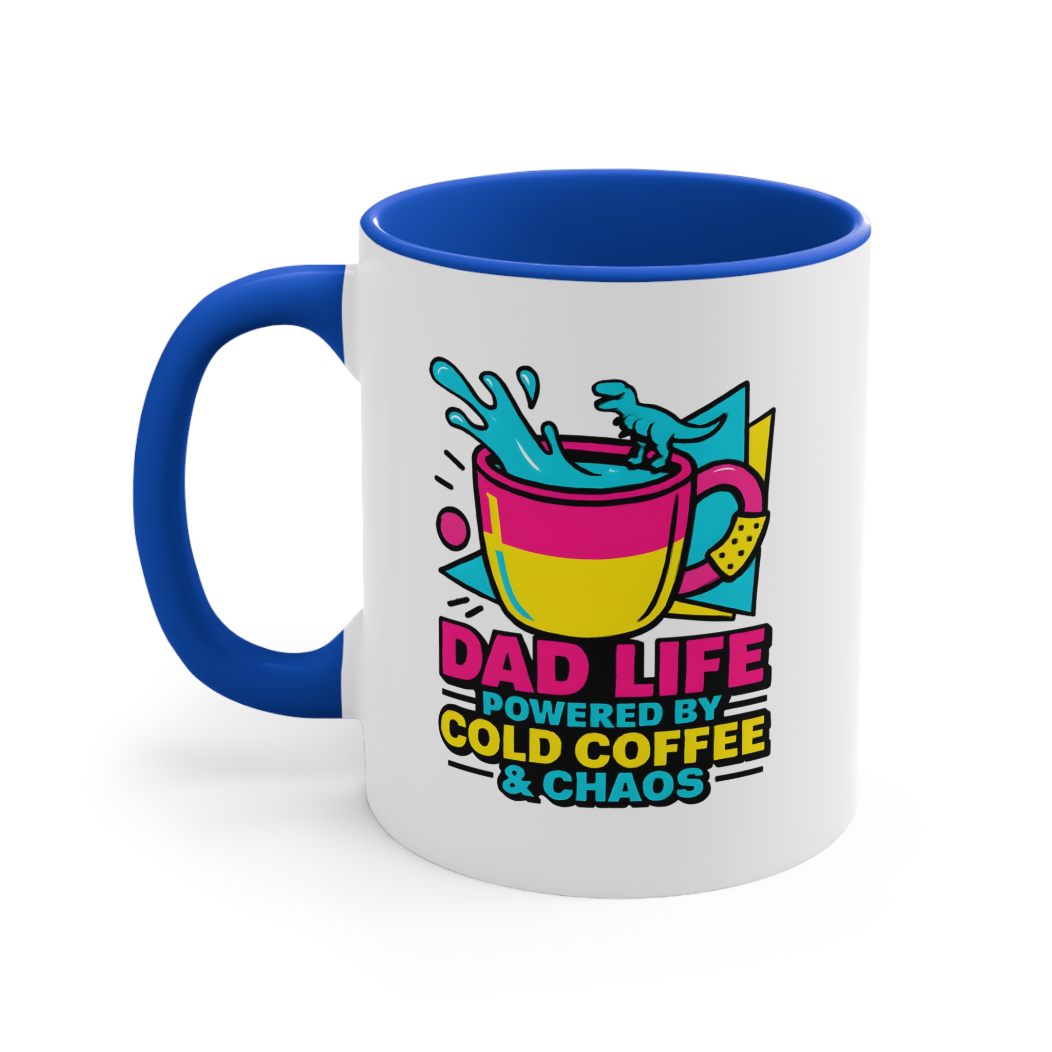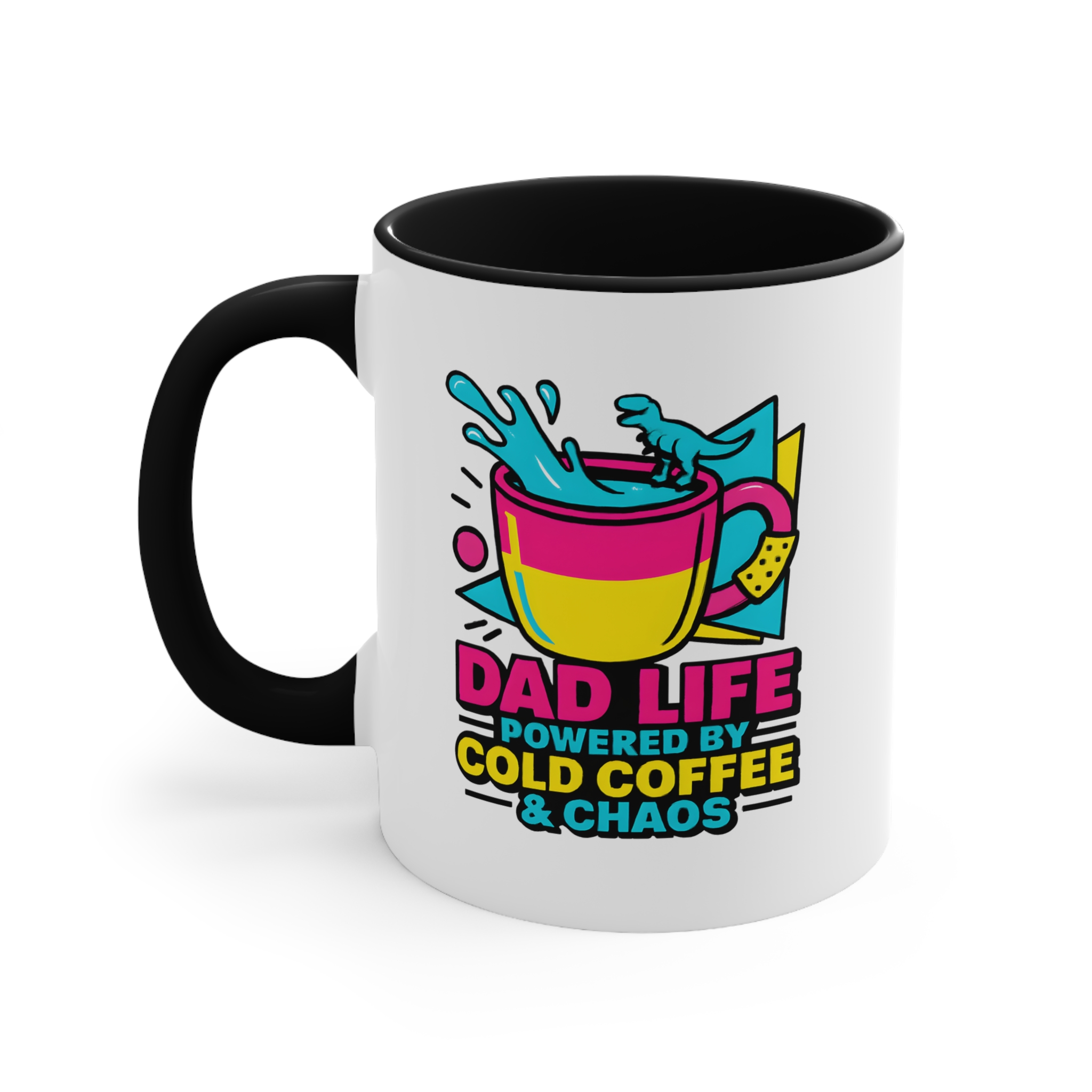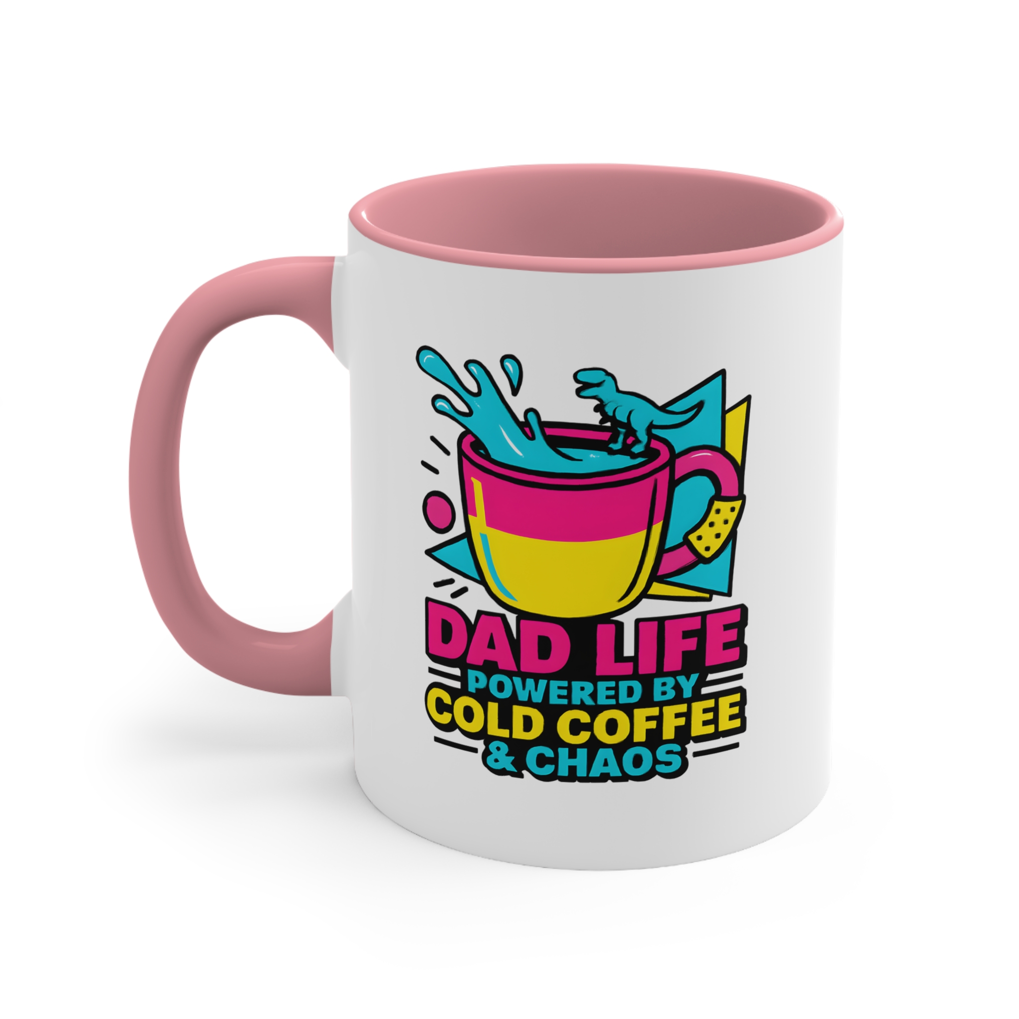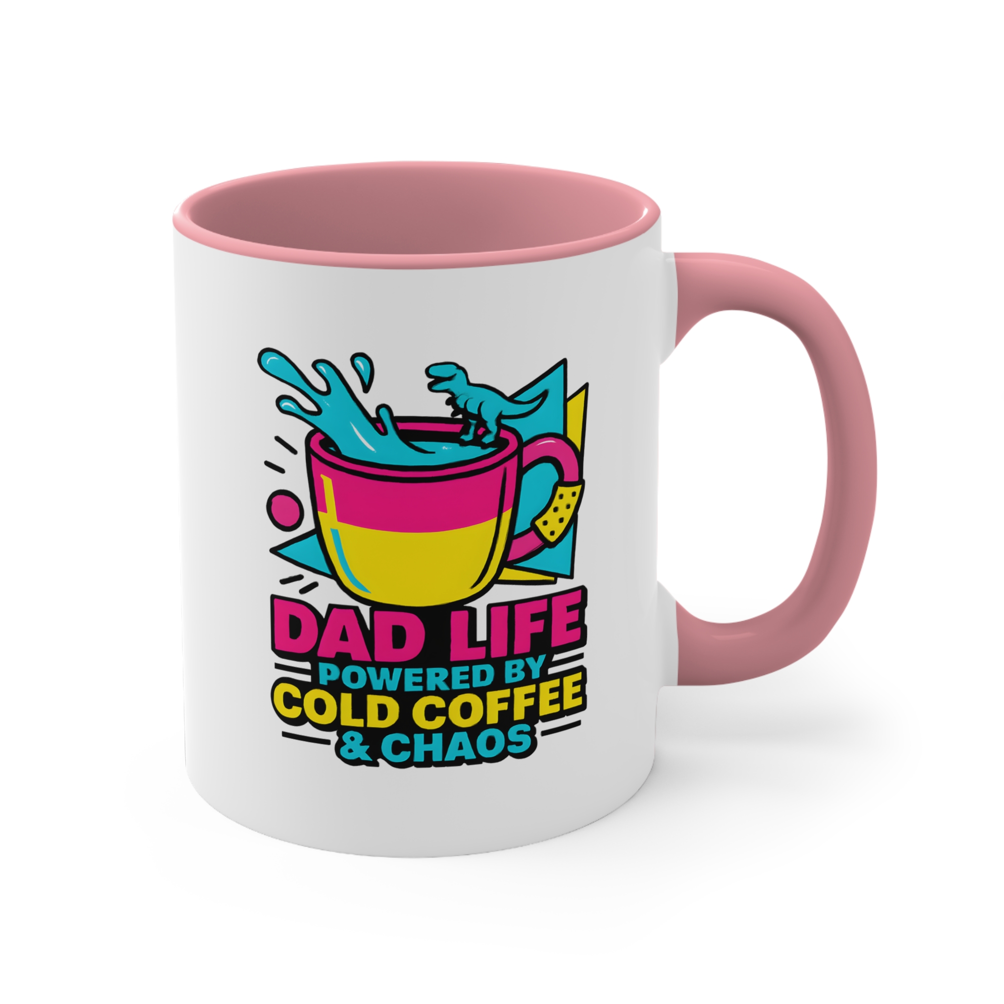 Dad life coffee mug with colourful “Powered by Cold Coffee & Chaos” design. 11oz ceramic mug with red handle and interior. Microwave safe, hand wash recommended.