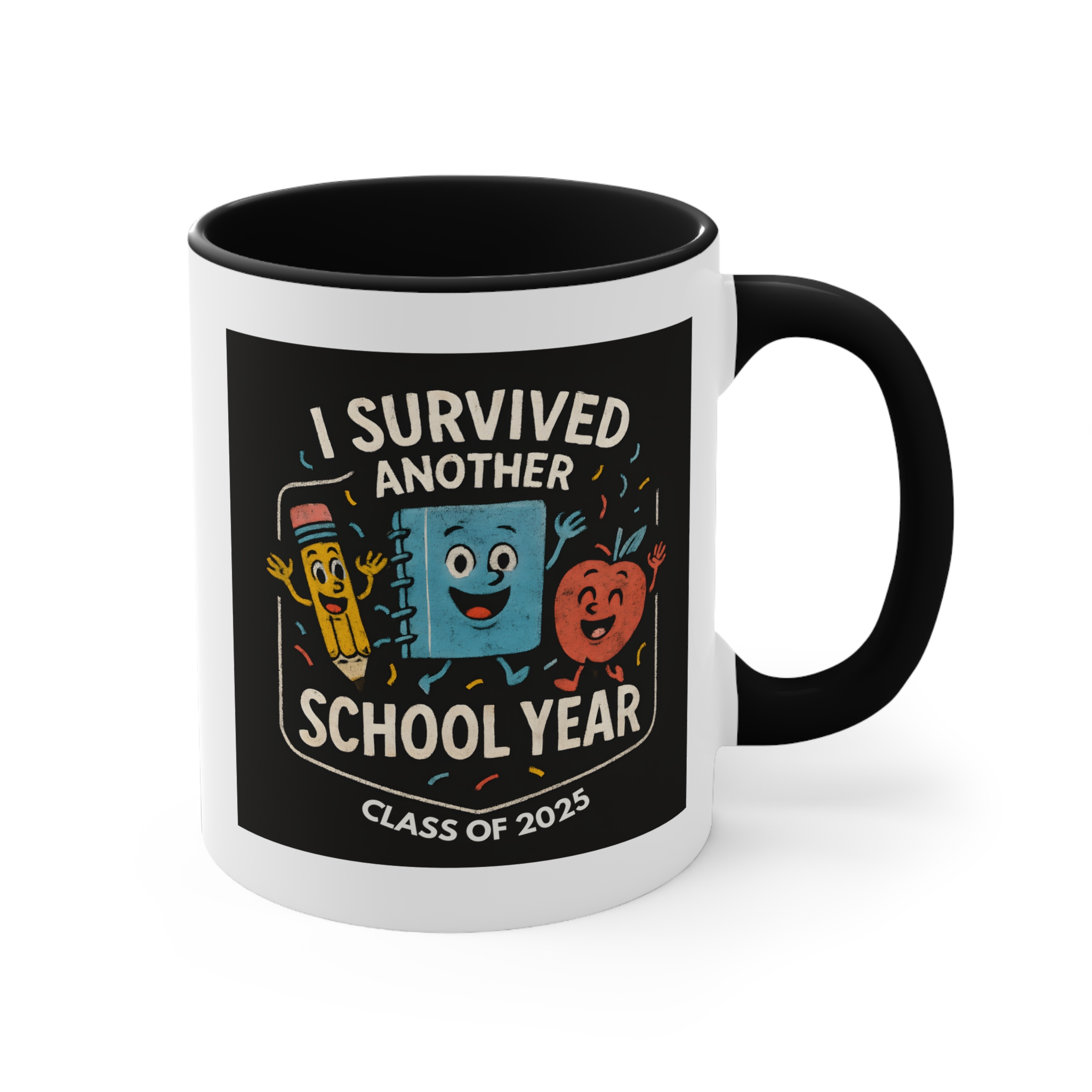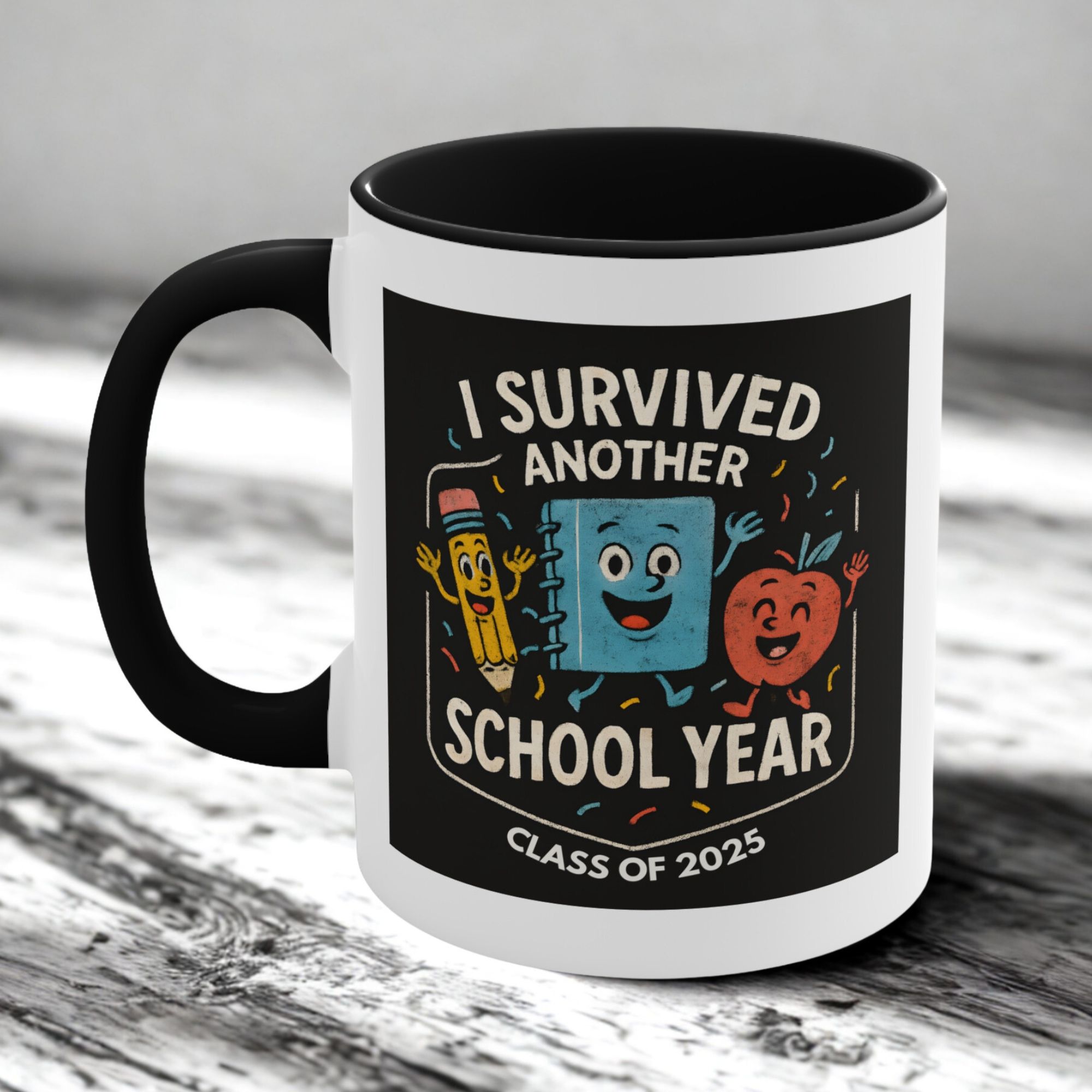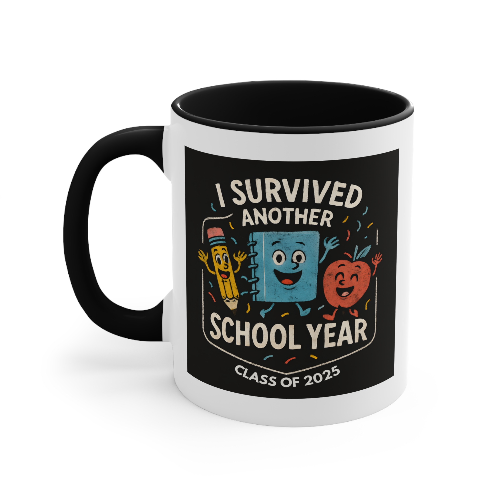 End of year teacher mug featuring the “I Survived Another School Year – Class of 2025” design. 11oz ceramic mug with black handle, microwave safe, hand wash recommended.