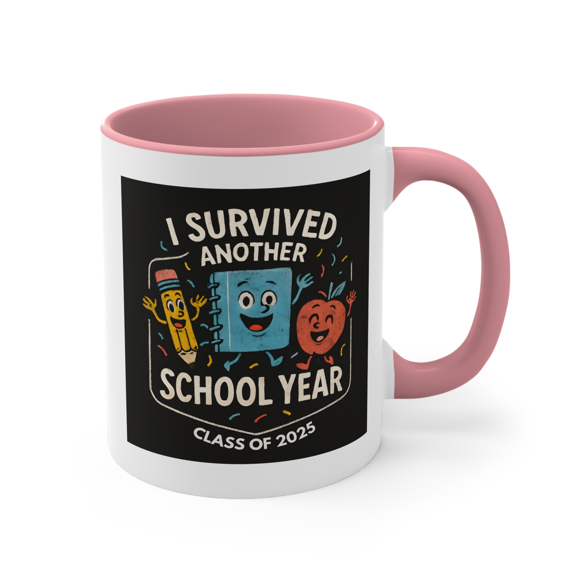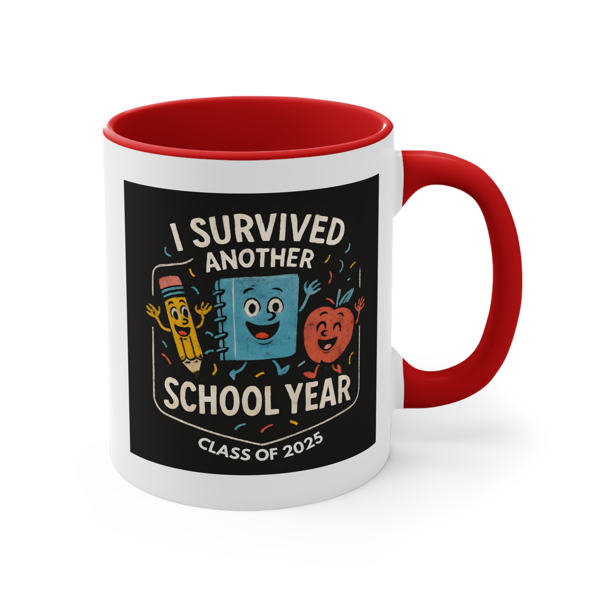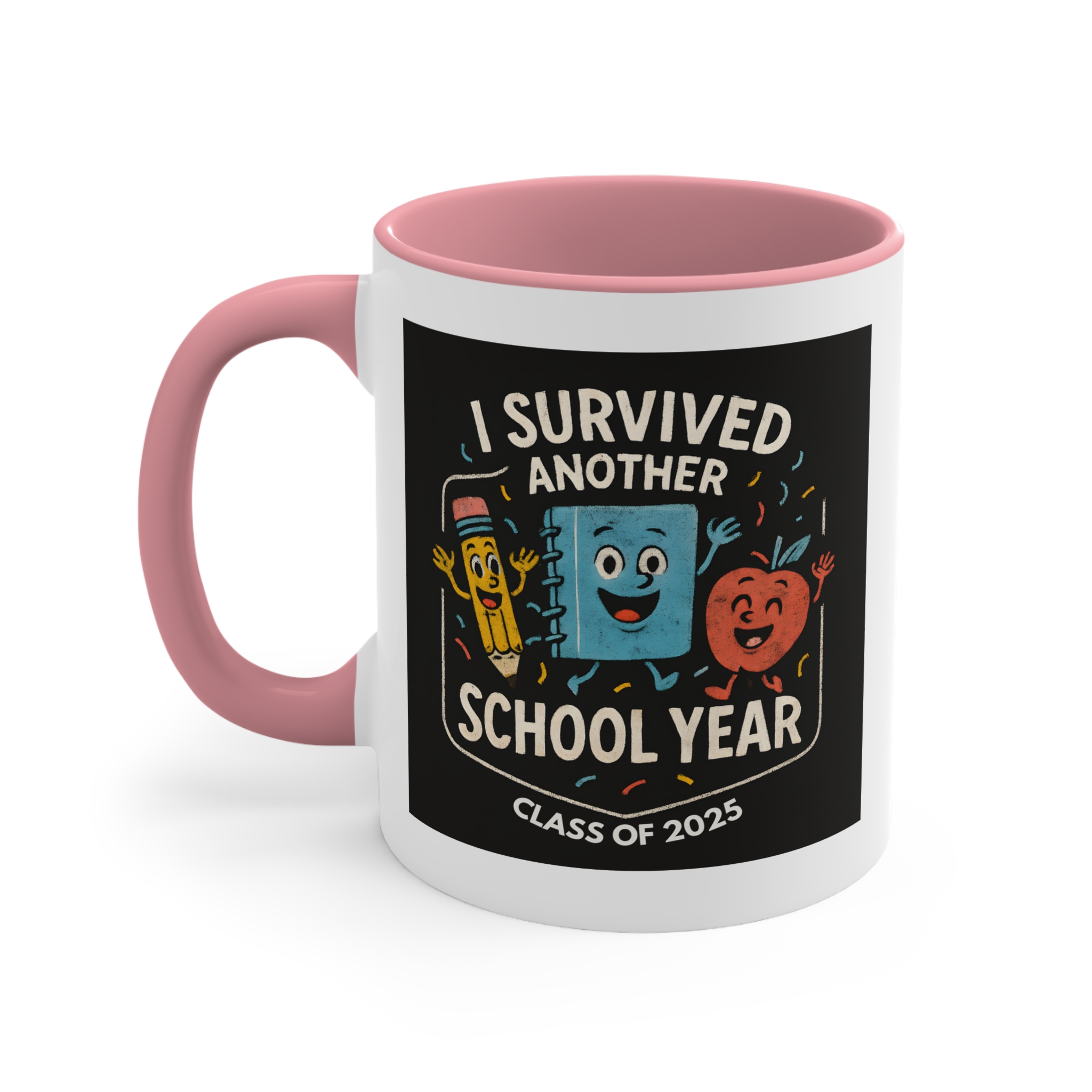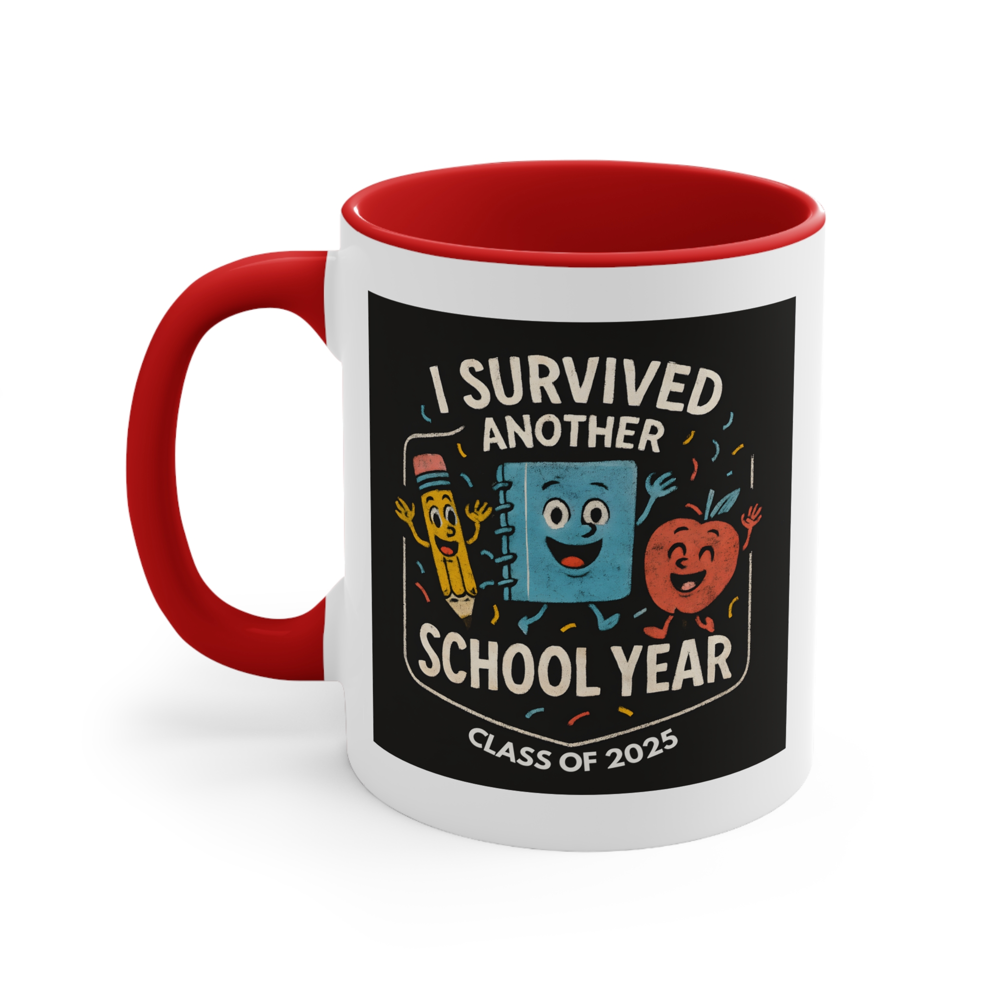 End of year teacher mug featuring the “I Survived Another School Year – Class of 2025” design. 11oz ceramic mug with black handle, microwave safe, hand wash recommended.