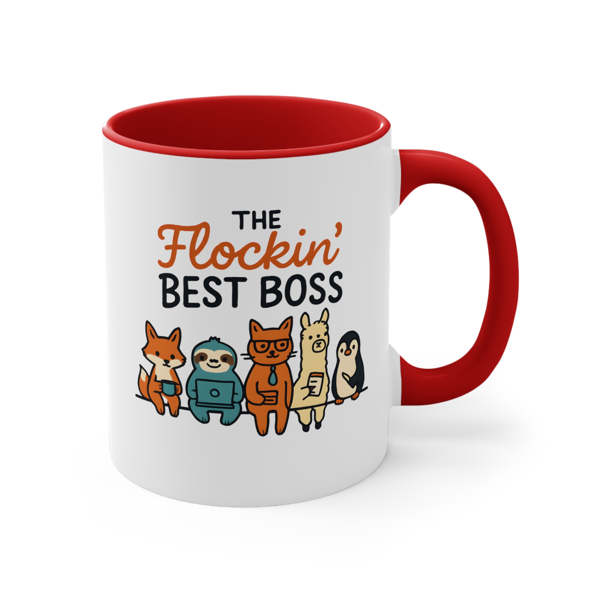 Funny team boss mug with playful animal design. 11oz ceramic mug with red handle, microwave safe, hand wash recommended.