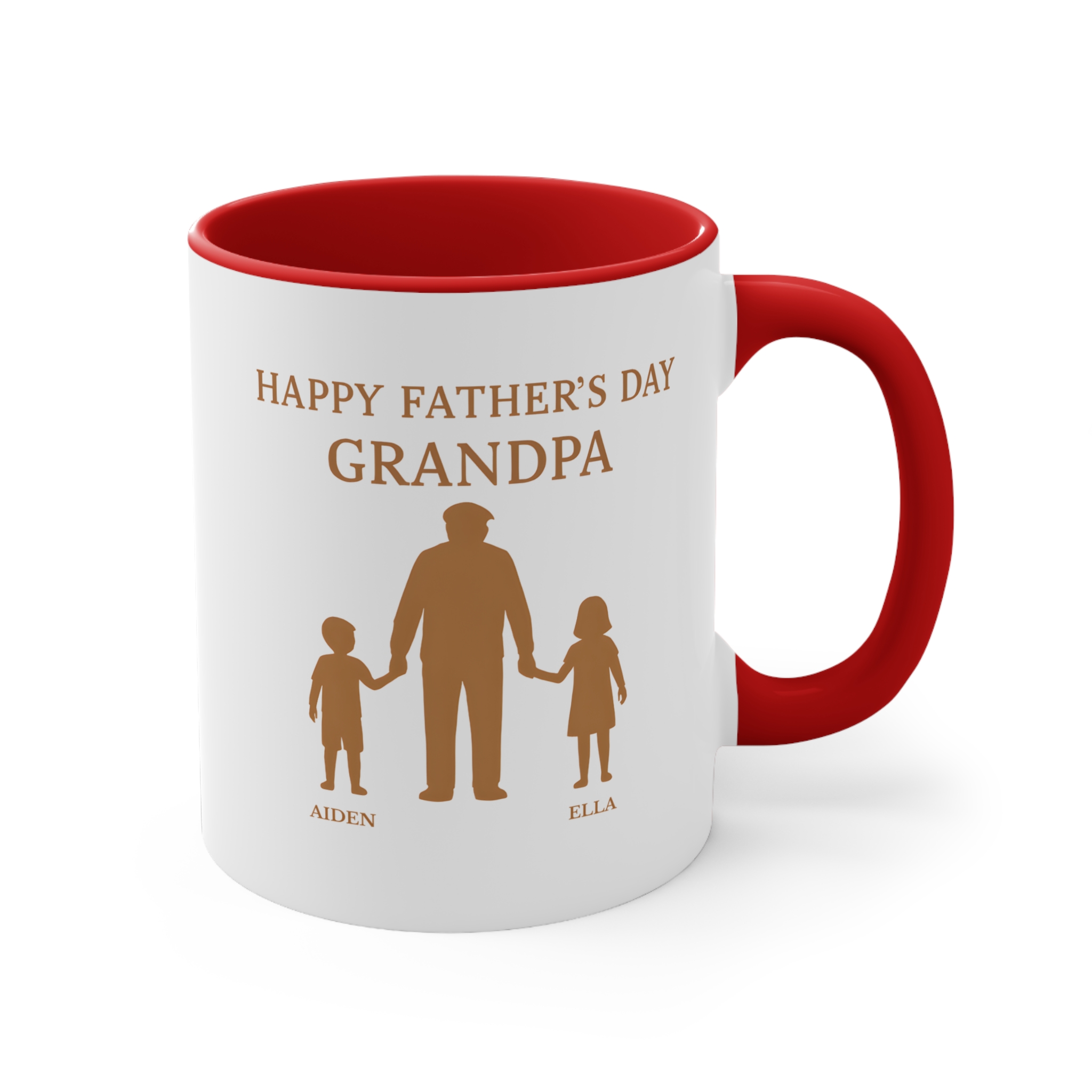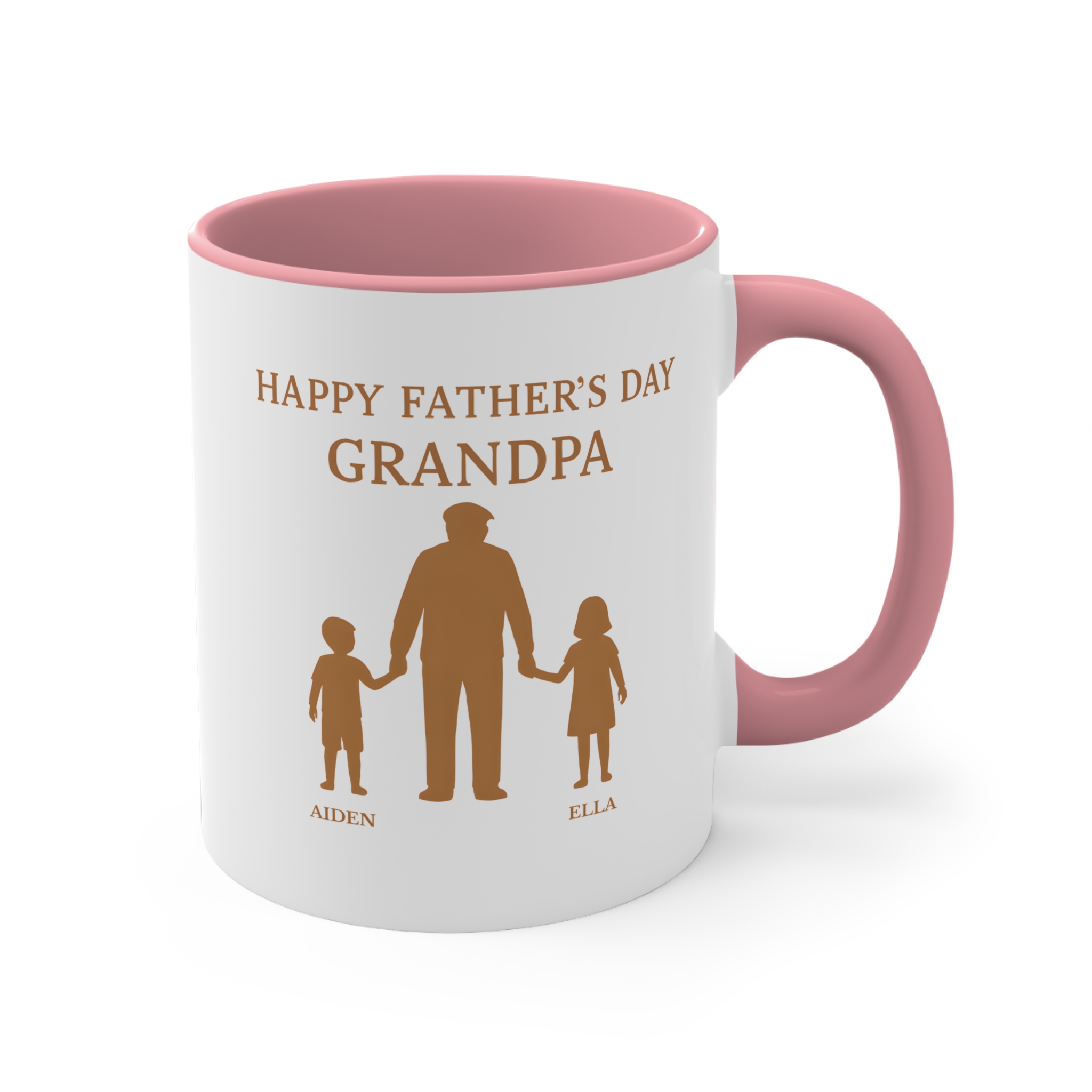 Grandad with grandkids personalised mug with 2 custom names. 11oz ceramic, microwave safe. Perfect Father’s Day keepsake gift.