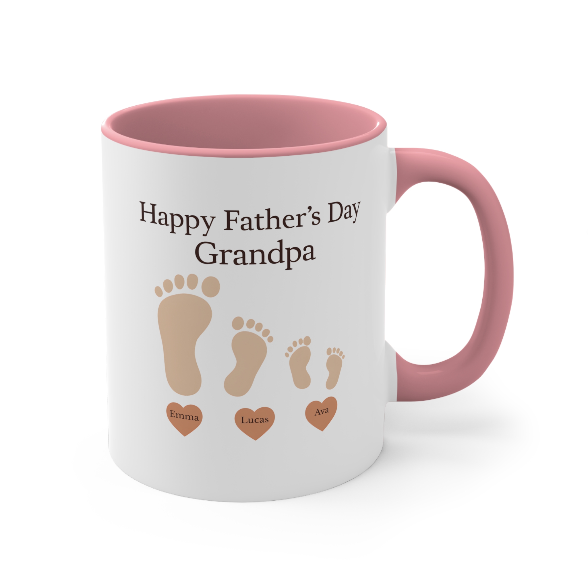 Personalised grandad footprints mug with up to 3 custom names. 11oz ceramic, microwave safe. Perfect Father’s Day keepsake gift.