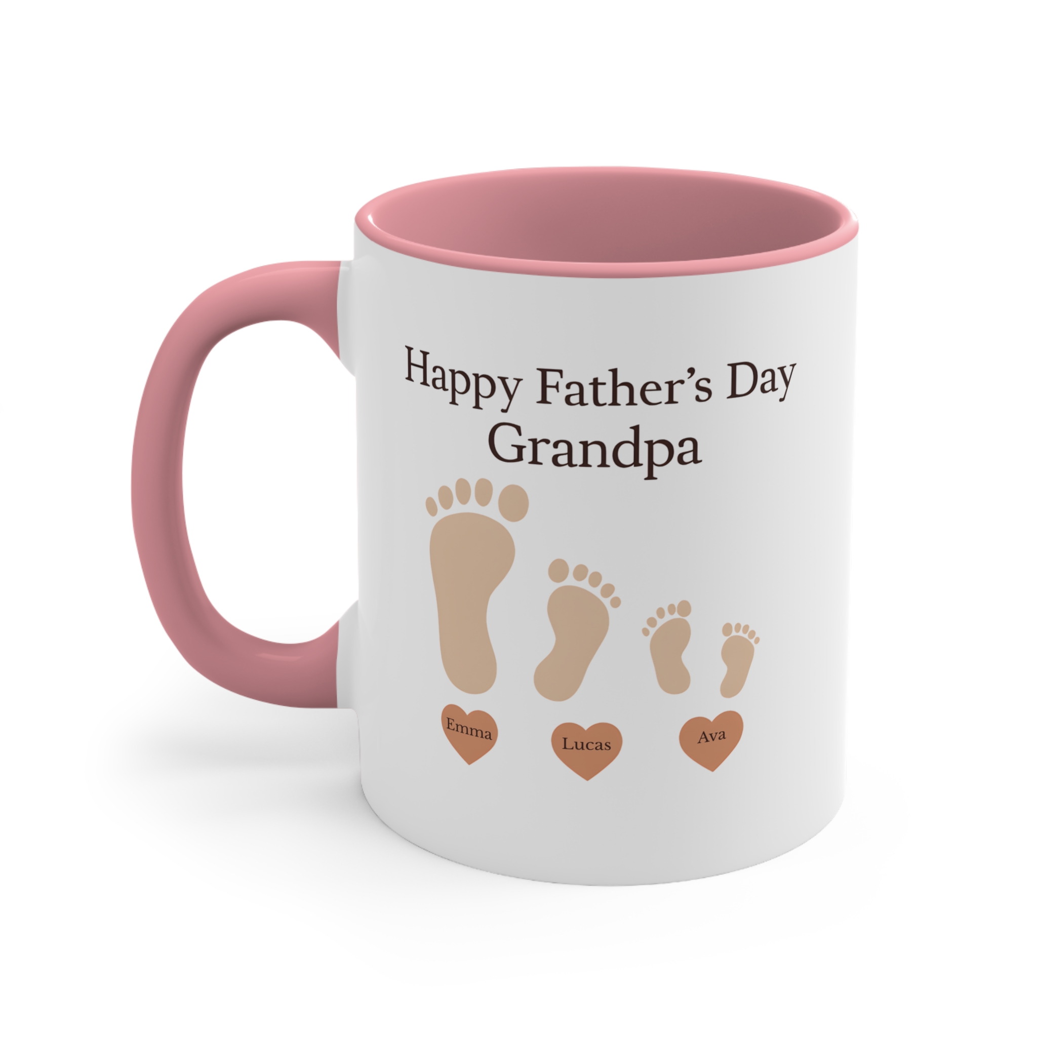 This personalised grandad footprints mug is a heartfelt way to celebrate the love between Grandad and his grandchildren. Featuring adorable footprint illustrations and custom names inside heart shapes, this mug makes a beautiful keepsake gift.