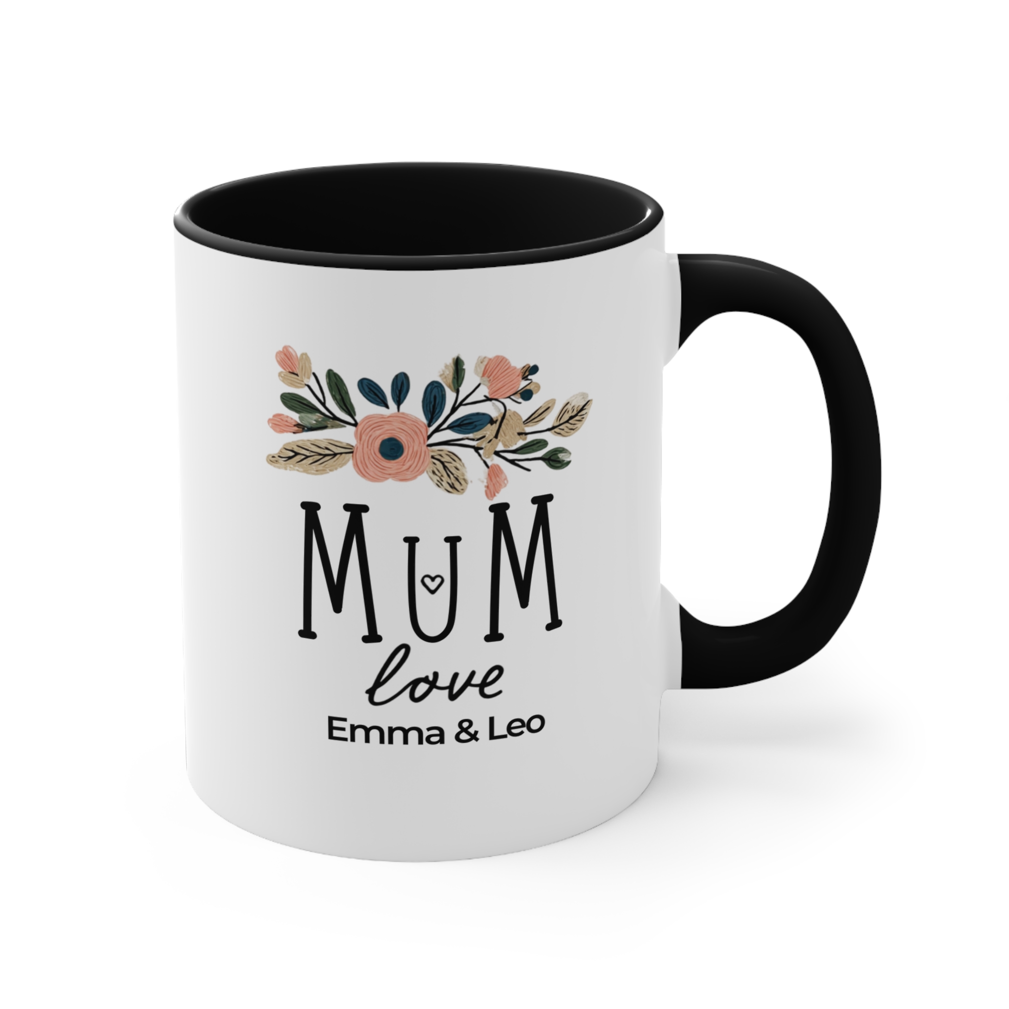 A personalised mum love mug with soft florals and custom names. 11oz ceramic, microwave safe, hand wash recommended.