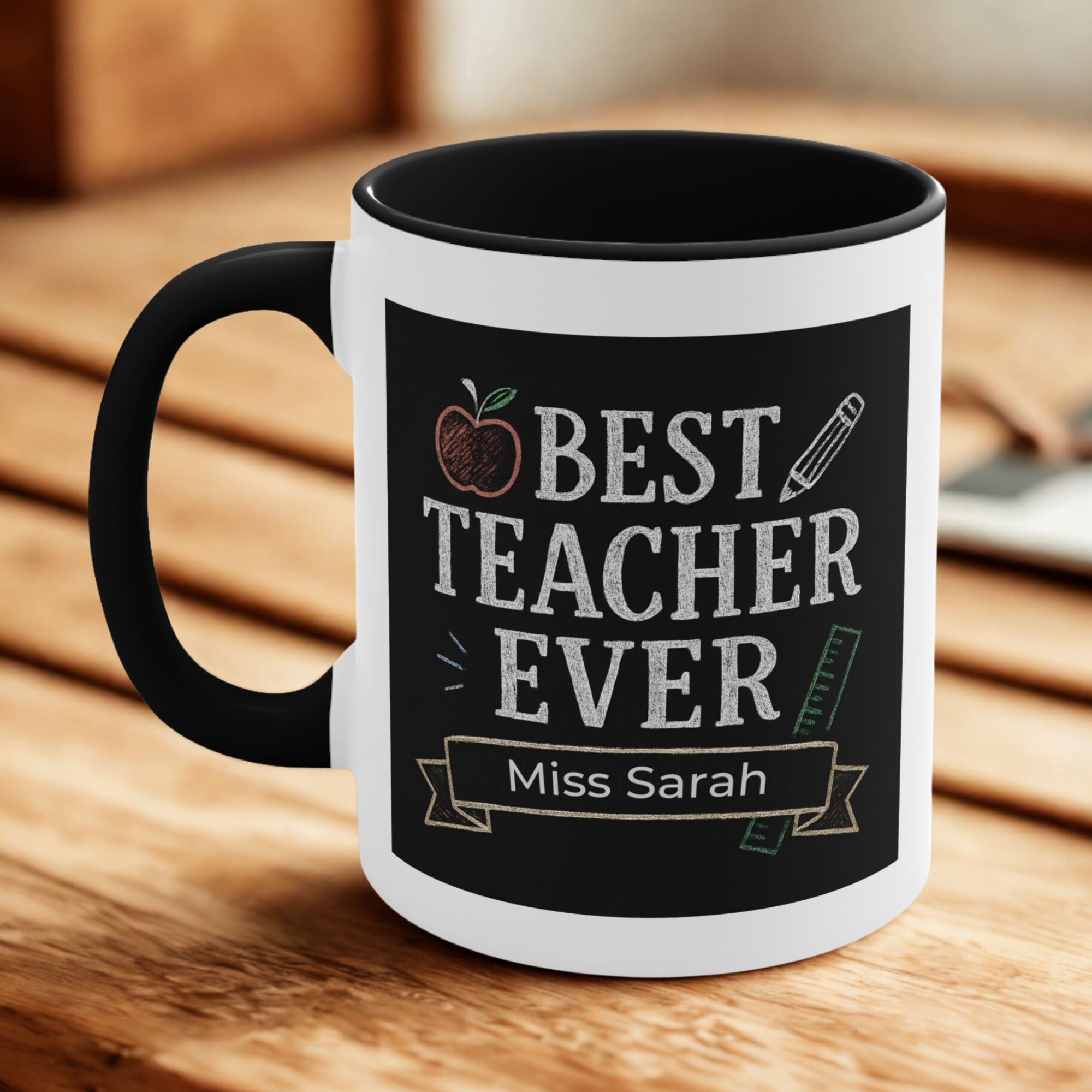 Personalised teacher mug featuring a chalkboard-style “Best Teacher Ever” design with custom name. 11oz ceramic mug with black handle, microwave safe, hand wash recommended.
