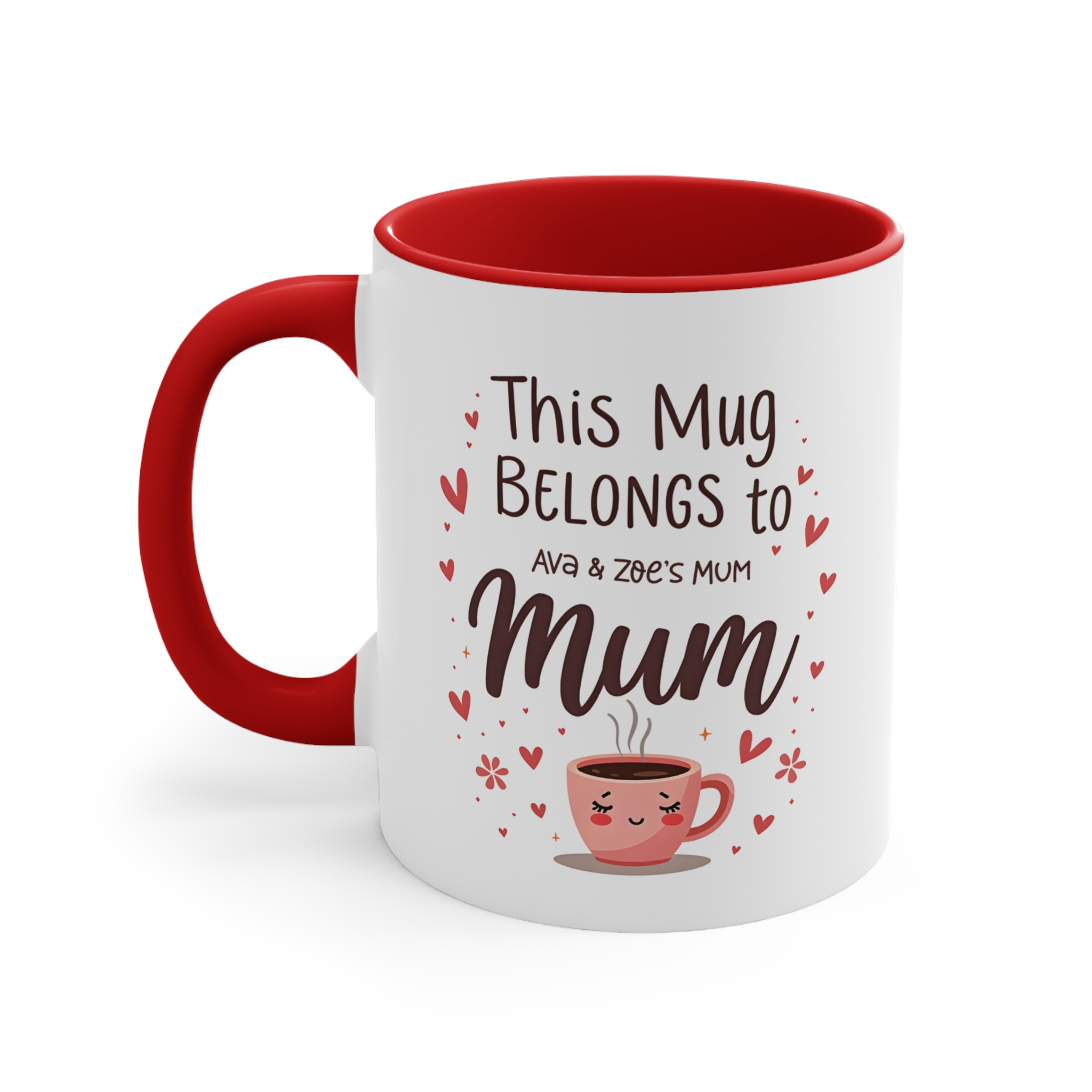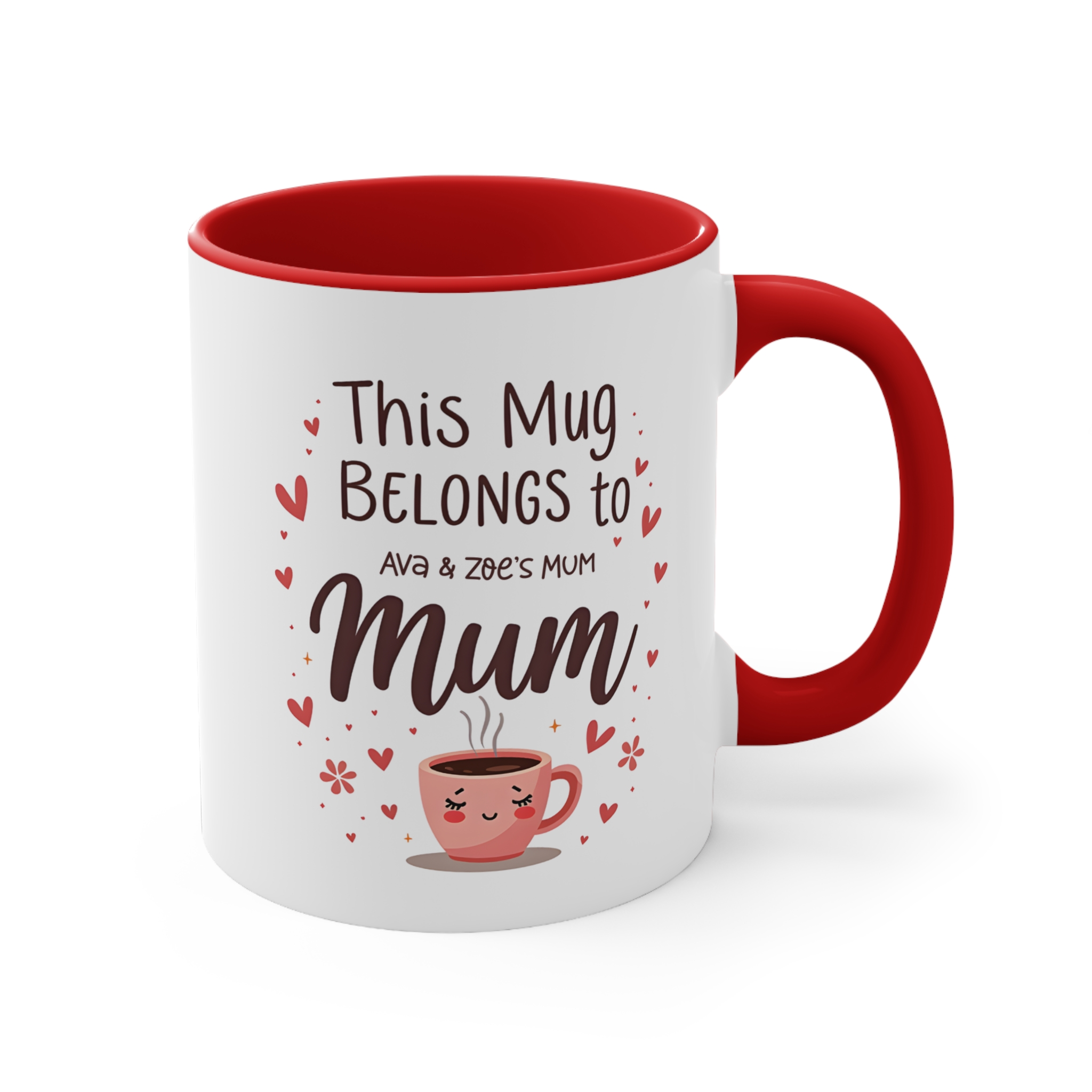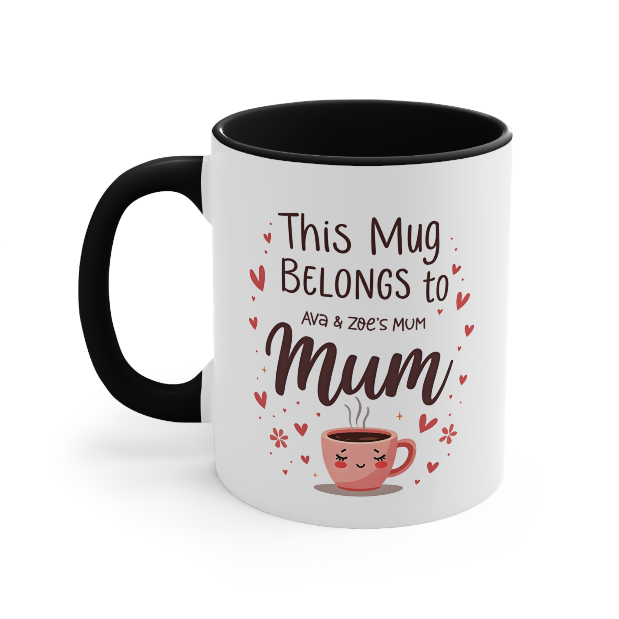 This personalised this mug belongs to mum design is a sweet and playful way to let Mum know she’s loved. Featuring a cute coffee cup illustration and personalised children’s names, this mug makes every sip feel extra special.