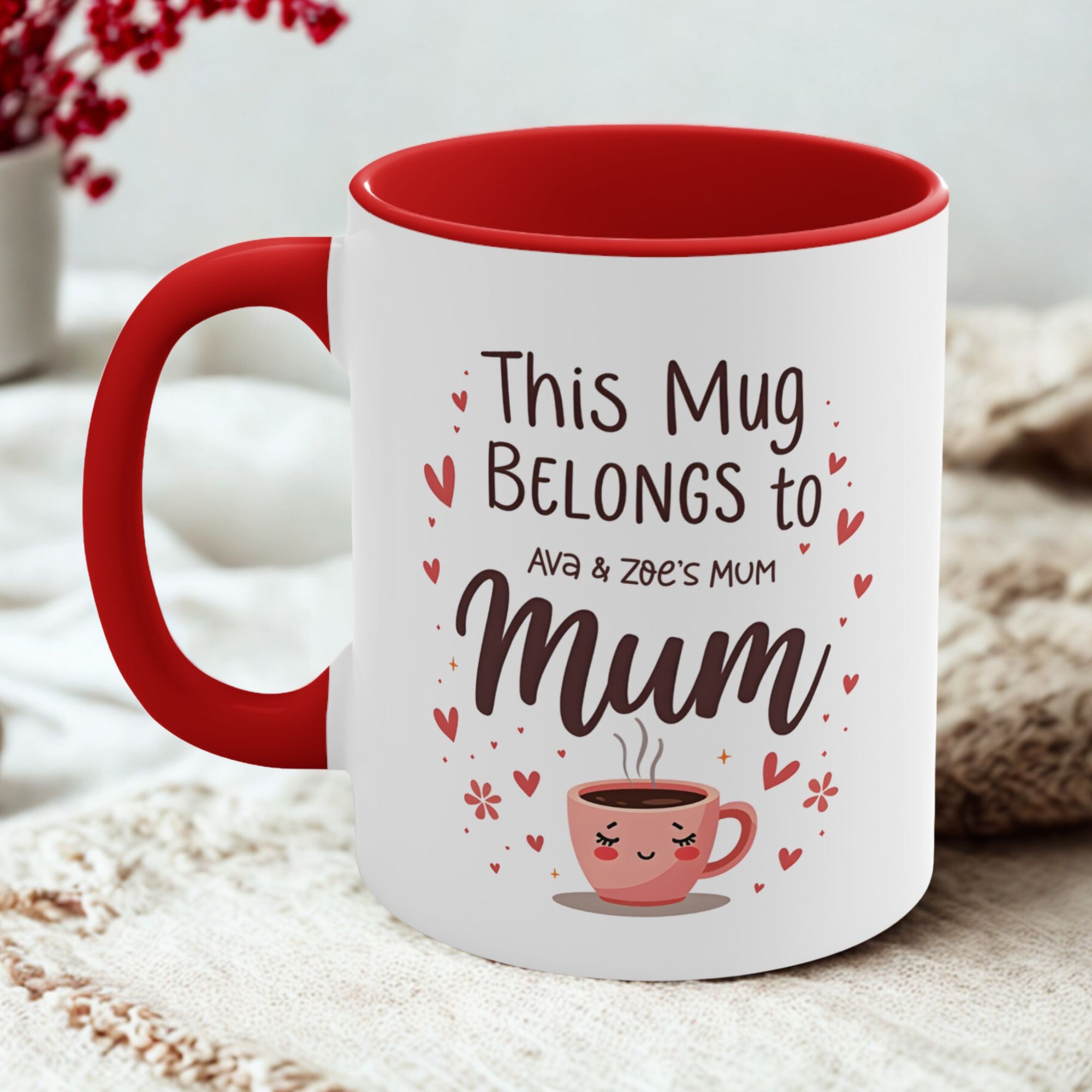 A personalised “this mug belongs to mum” mug with custom names and cute artwork. 11oz ceramic, microwave safe, hand wash recommended.