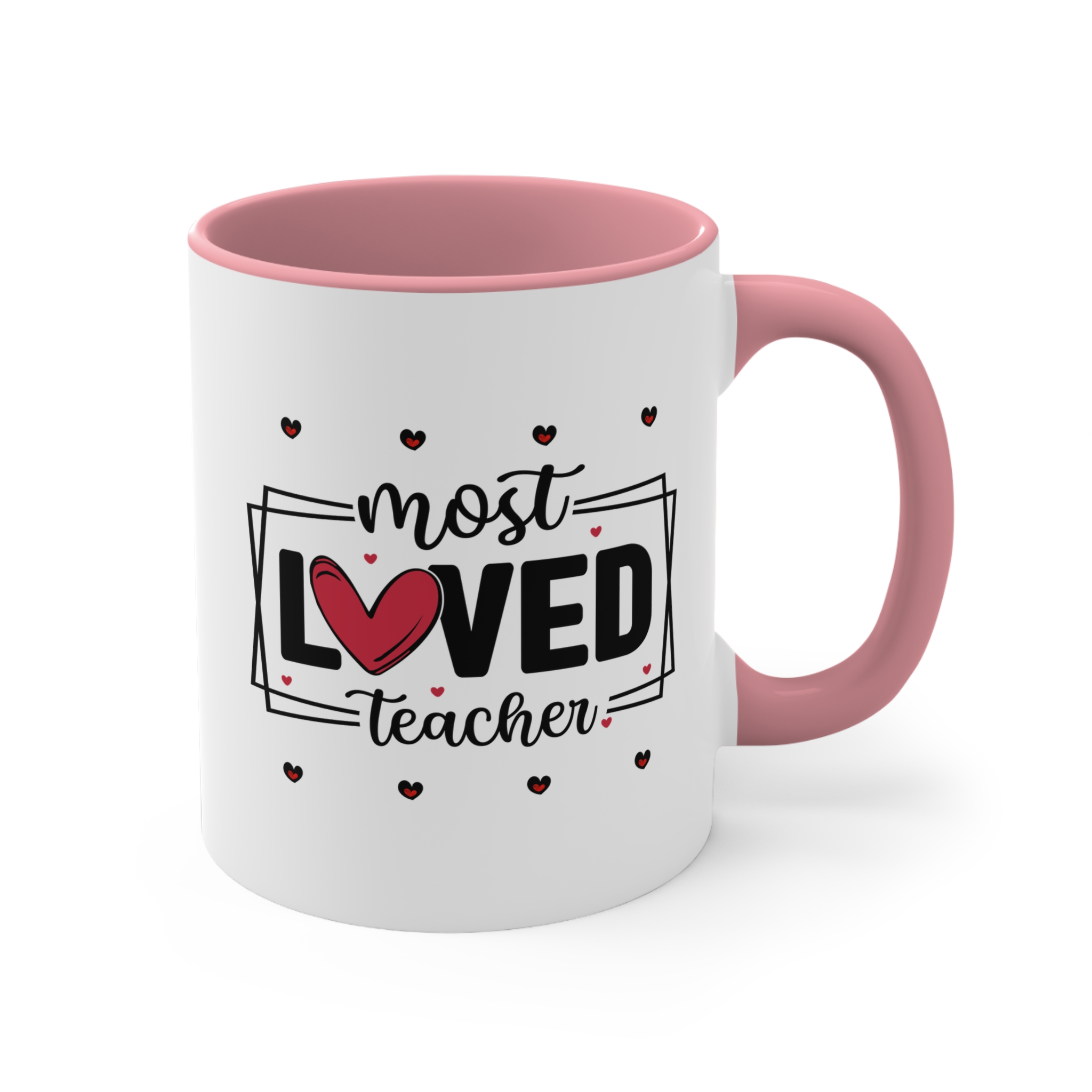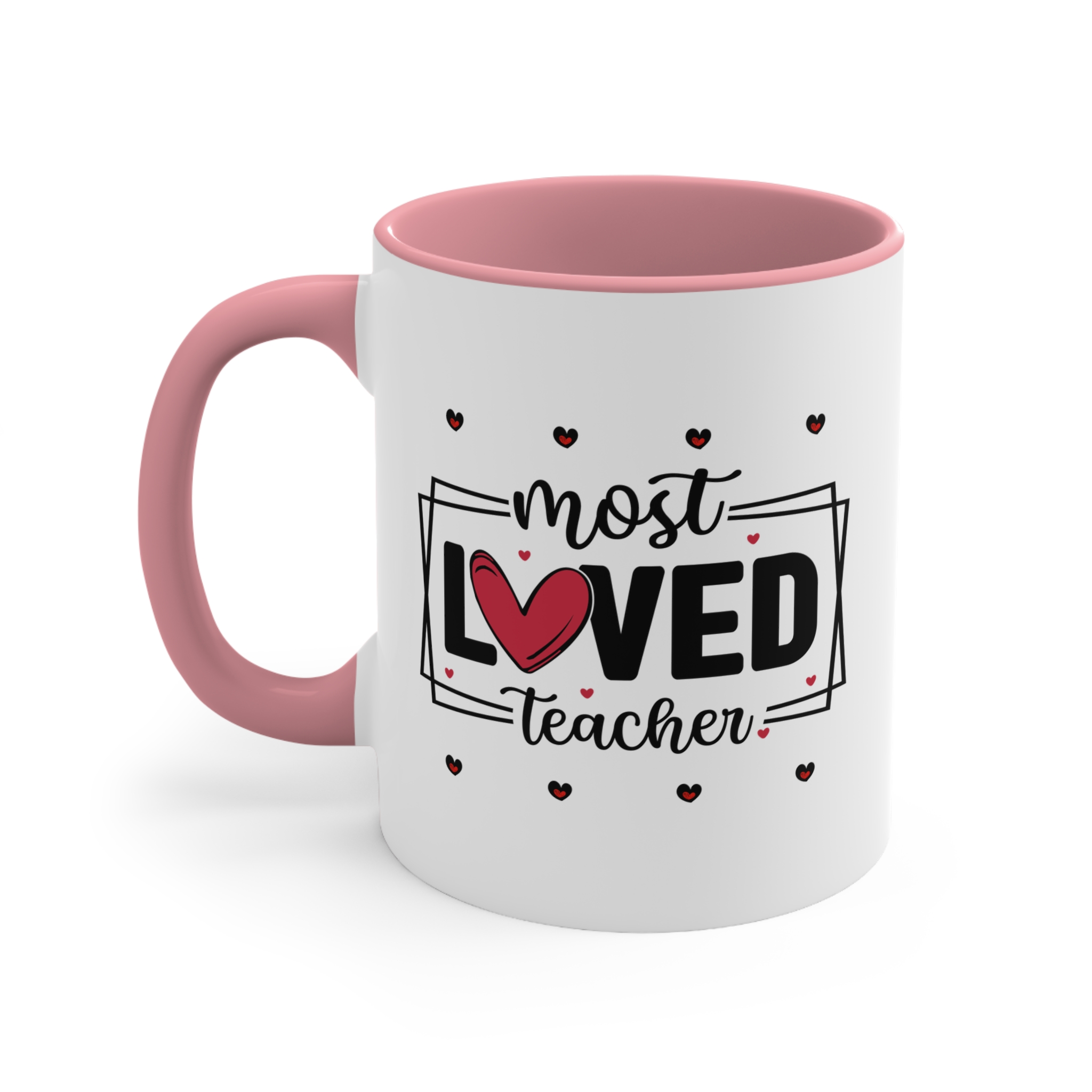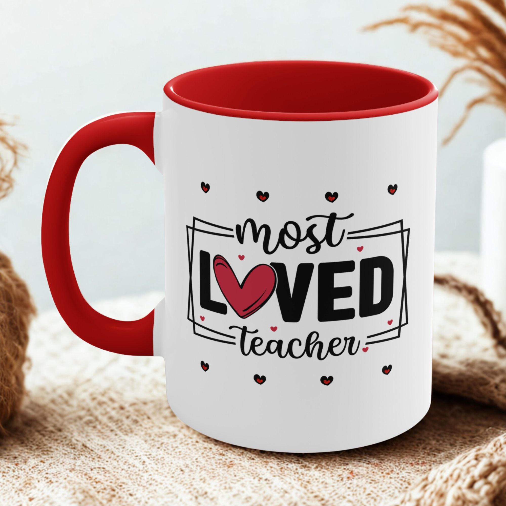 Teacher thank you gift featuring a “Most Loved Teacher” design with heart details. 11oz ceramic mug with colour handle, microwave safe, hand wash recommended.