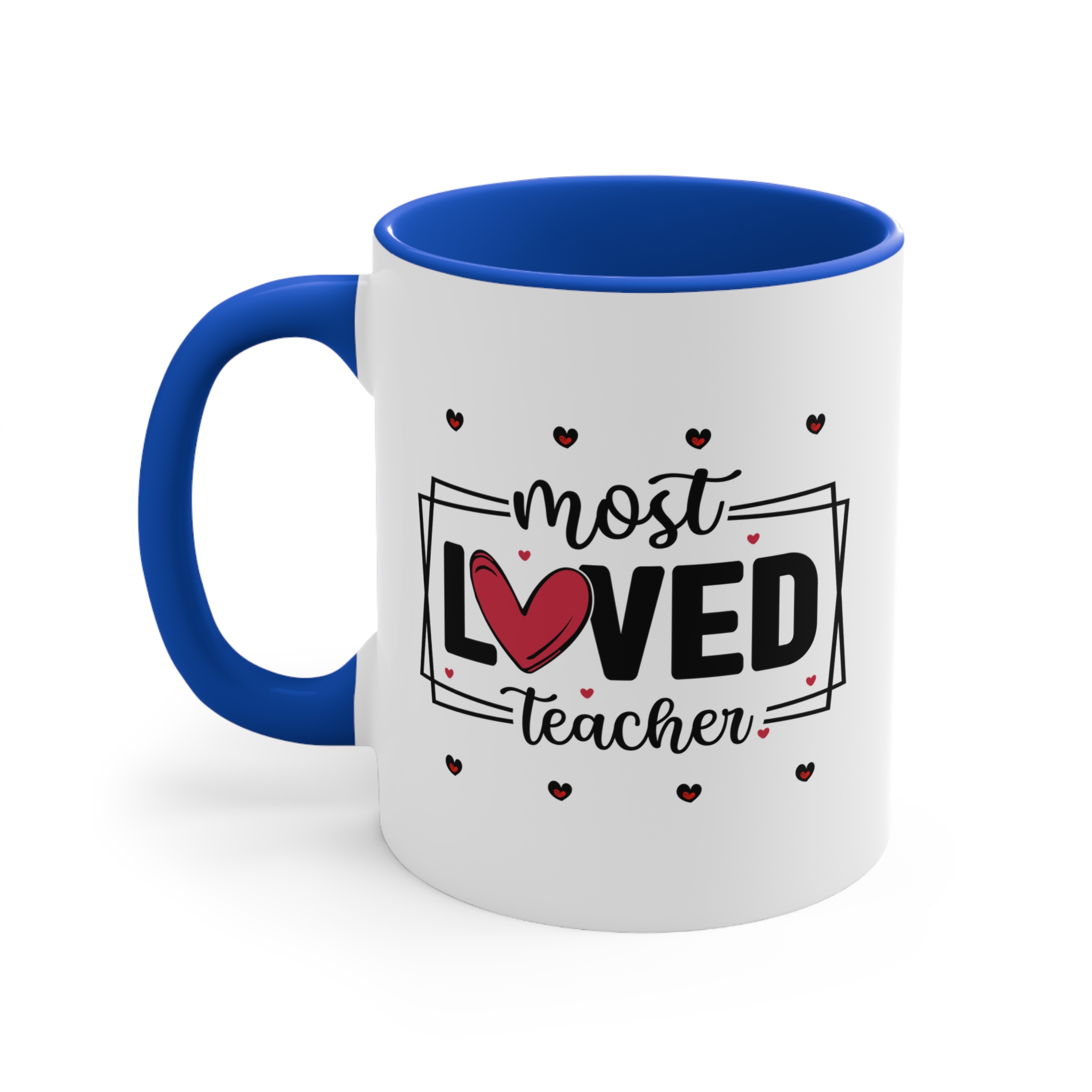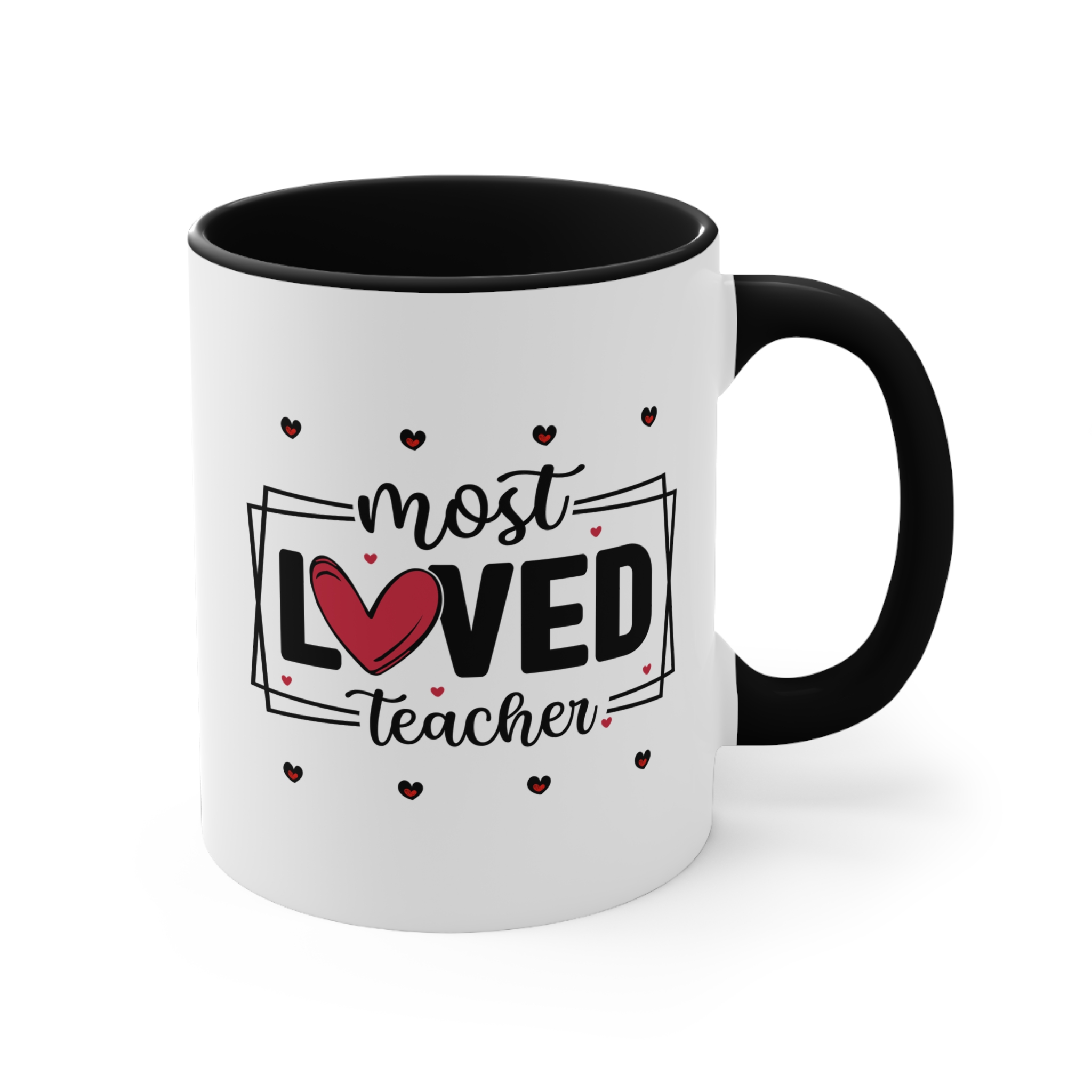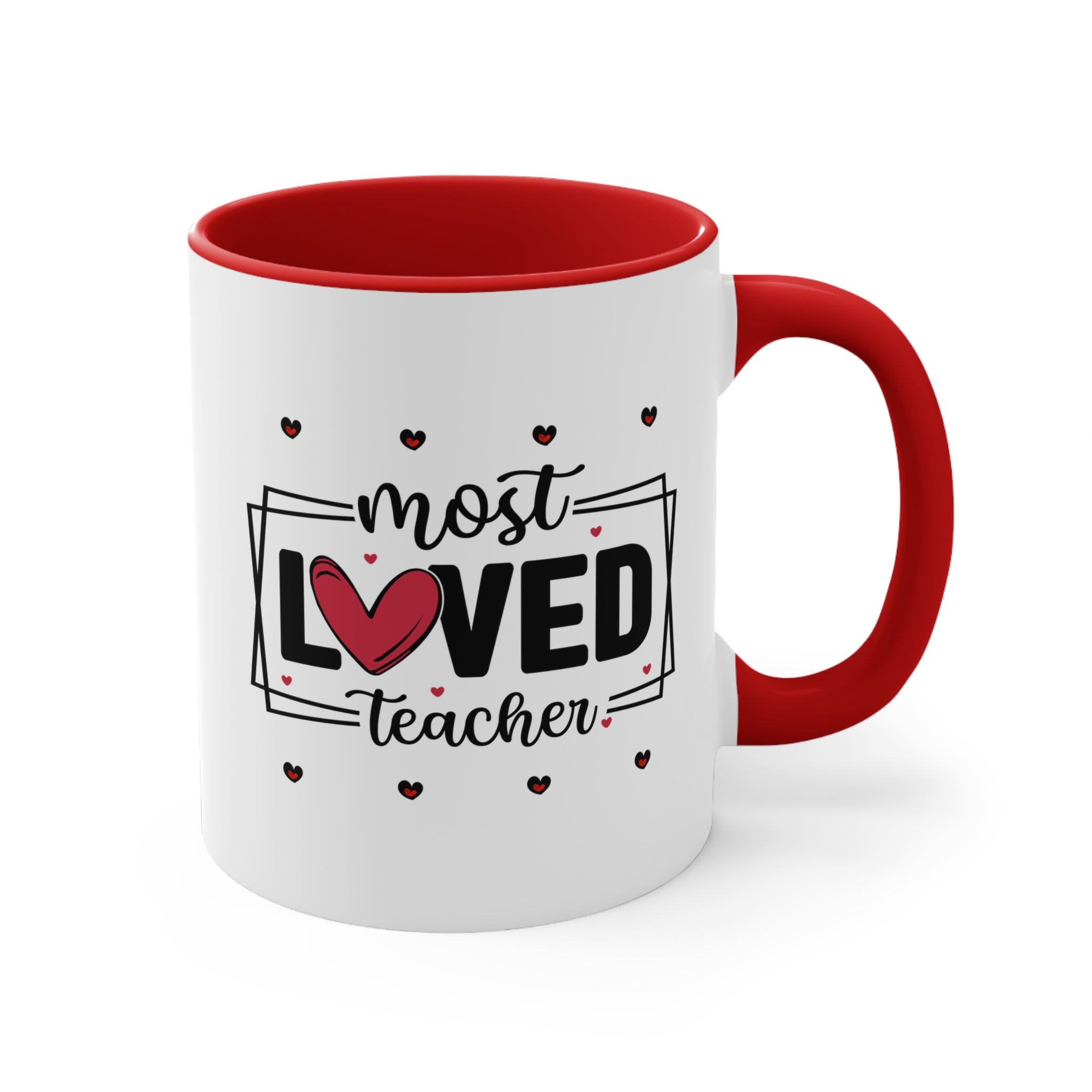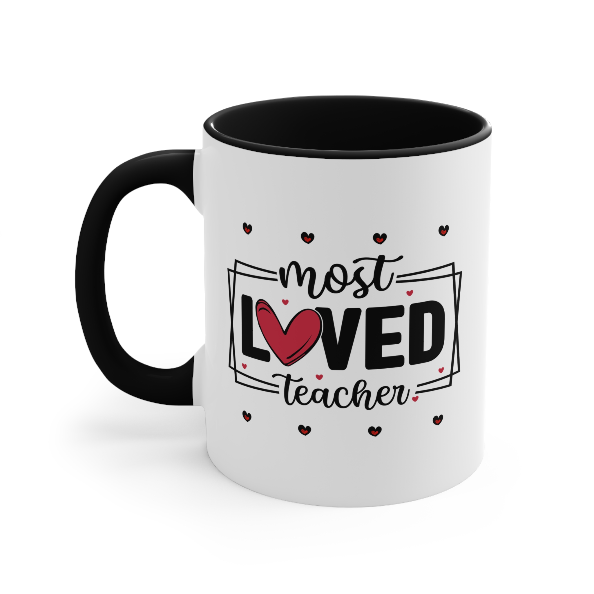 Teacher thank you gift featuring a “Most Loved Teacher” design with heart details. 11oz ceramic mug with colour handle, microwave safe, hand wash recommended.