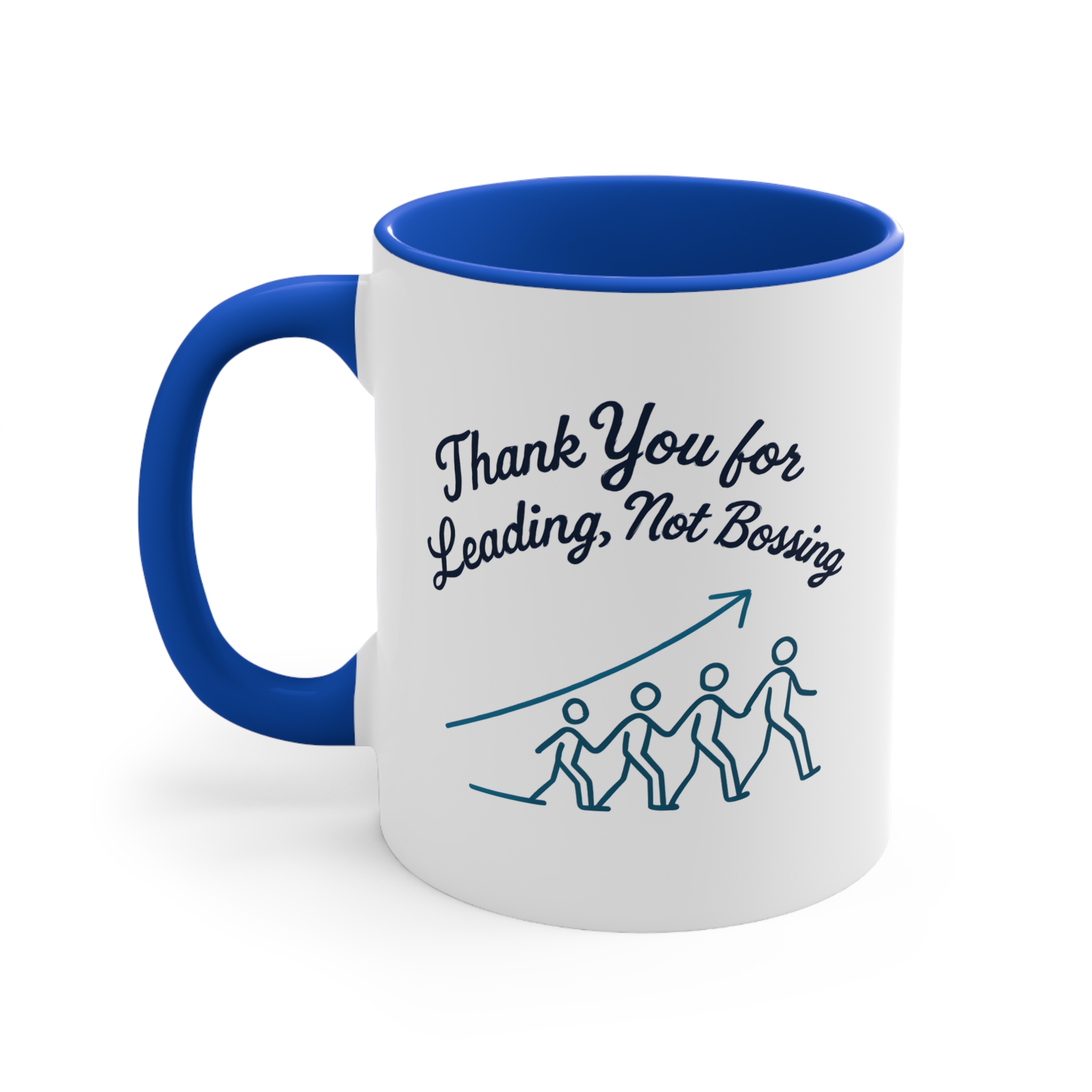 Thank you boss leadership mug with positive appreciation message. 11oz ceramic mug with blue handle, microwave safe, hand wash recommended.